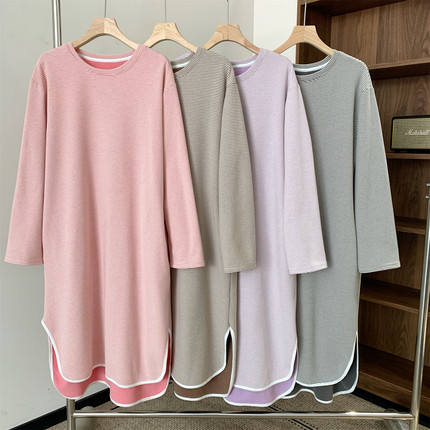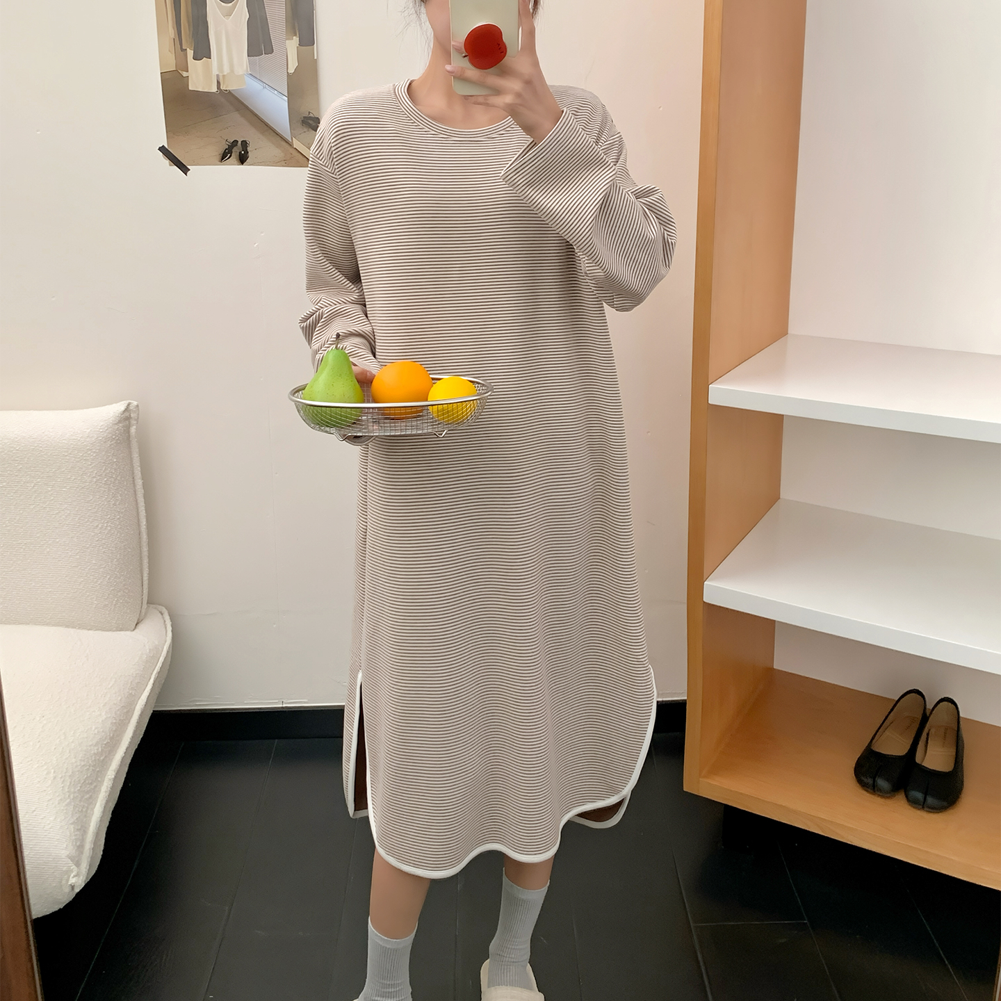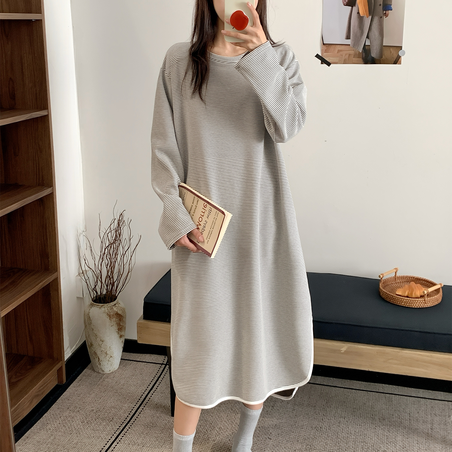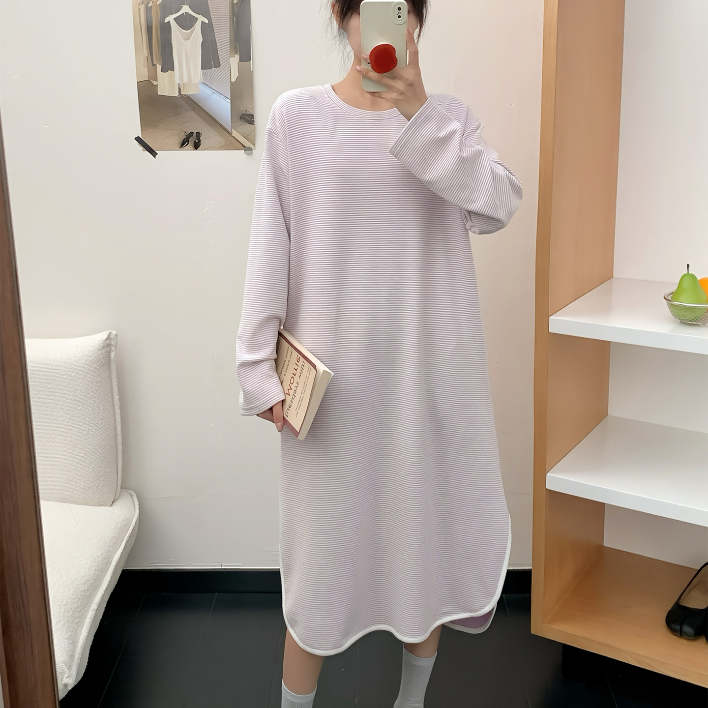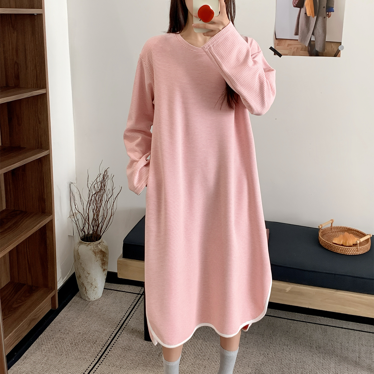 秋冬德绒条纹保暖长裙女士睡裙连衣裙宽松家居裙大码加绒加厚睡衣