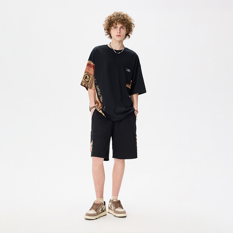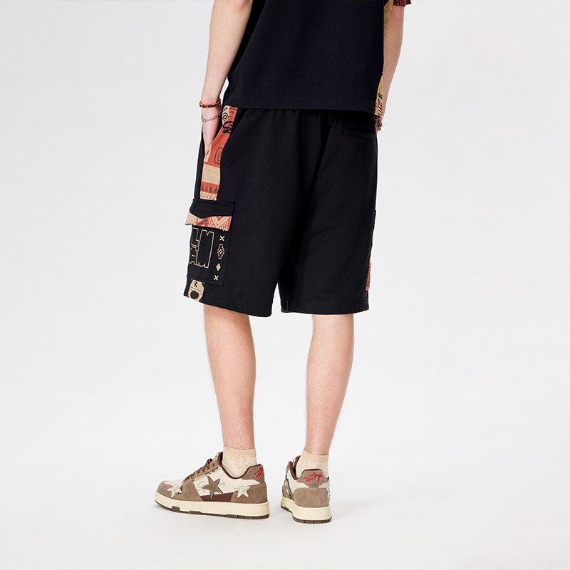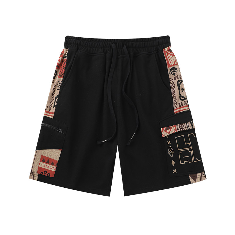 LAMLICKA侧口袋民族风印花休闲短裤男夏季潮牌黑色直筒宽松五分裤