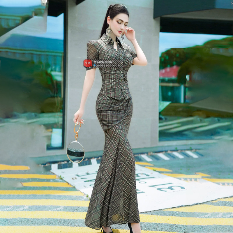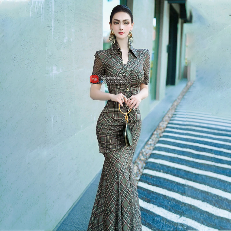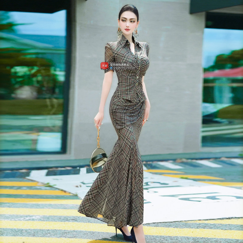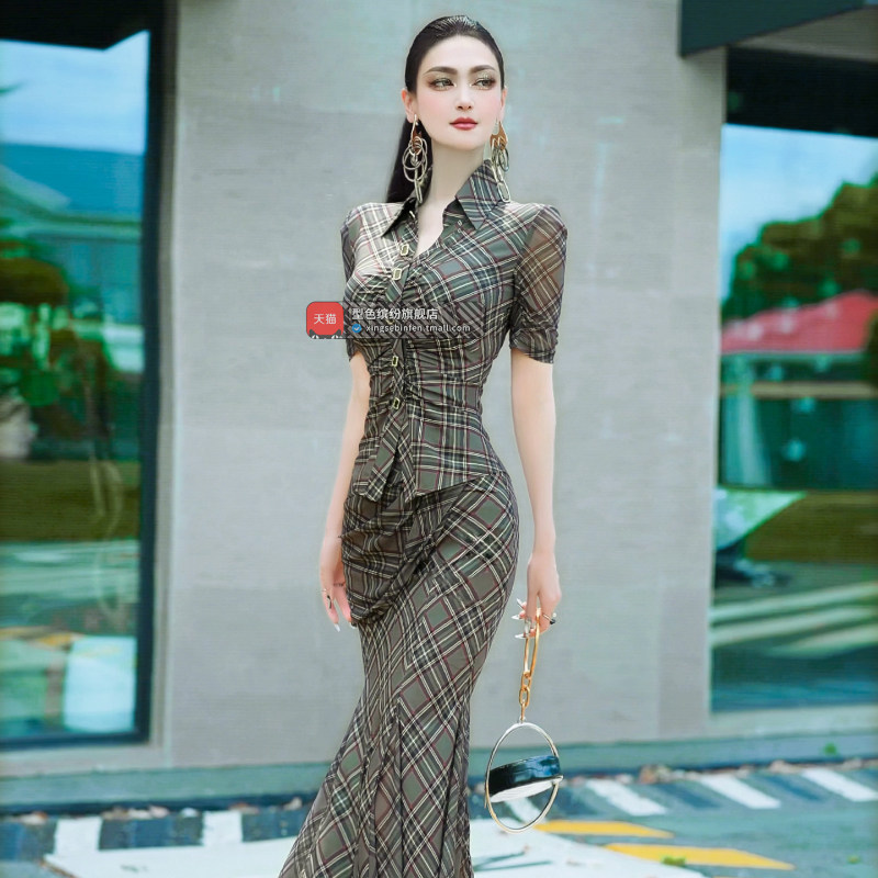 夏季格纹网纱拼接抽皱衬衫鱼尾裙两件套2025新款气质减龄裙子套装
