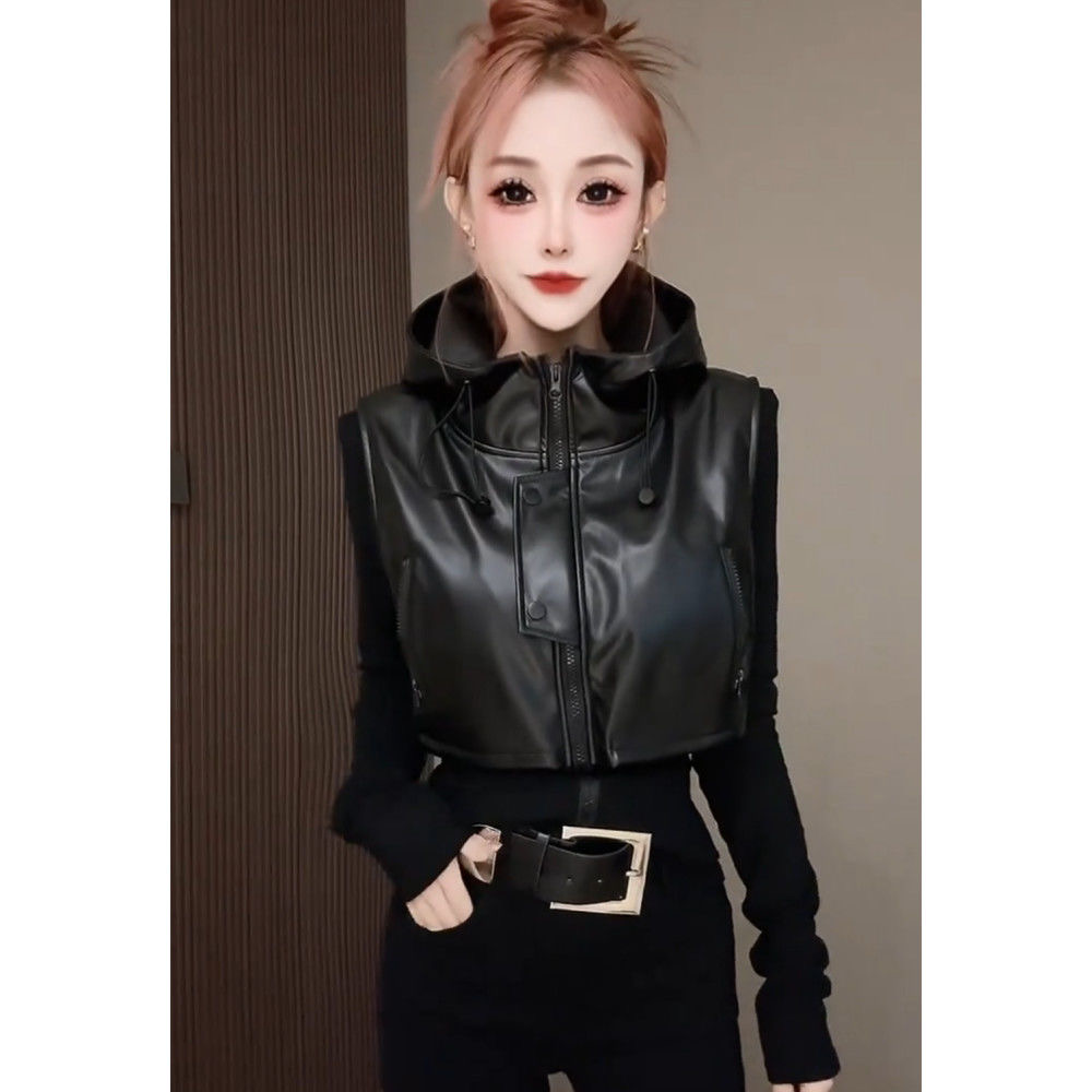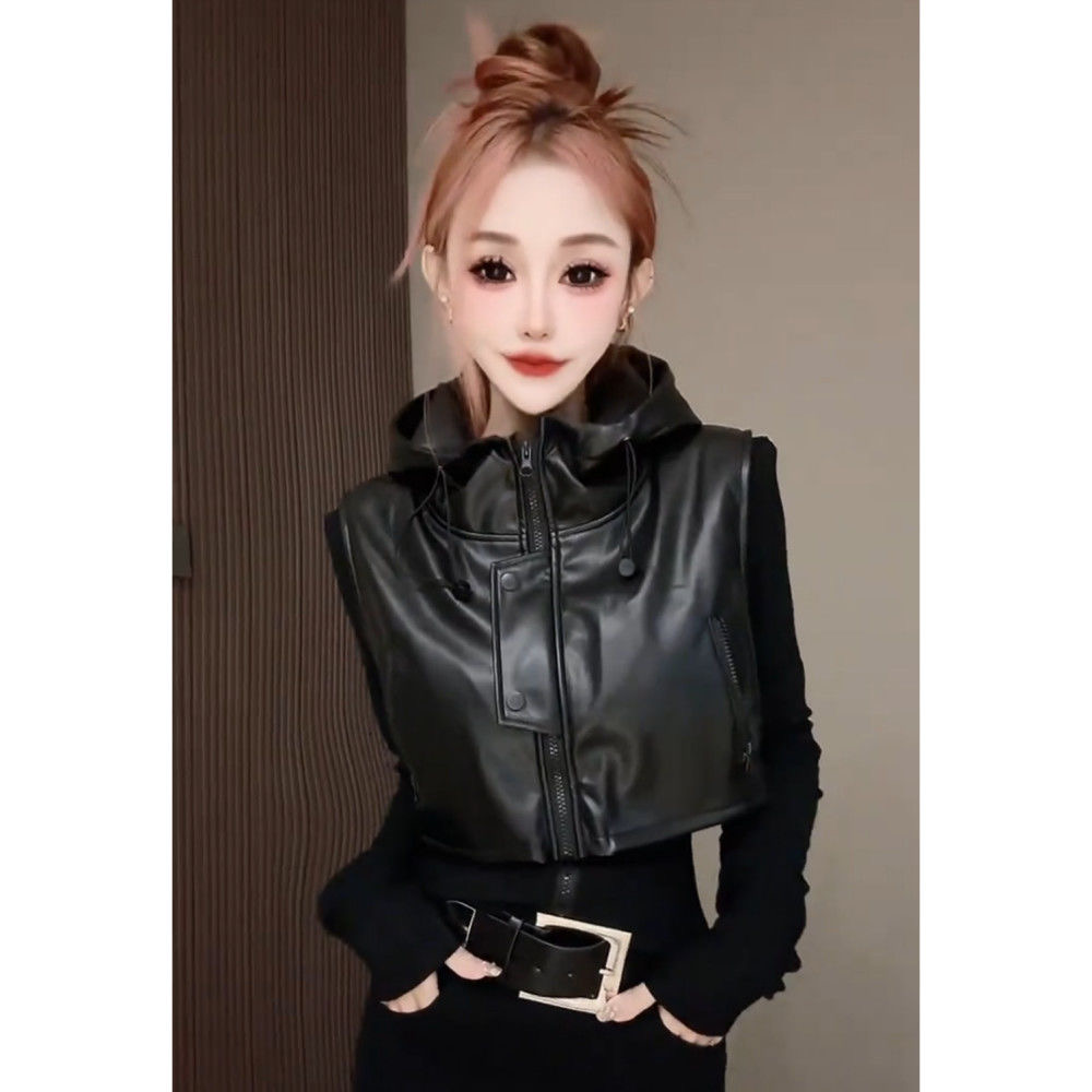 欧货高级连帽拼皮马夹假两件长袖衬衫女2025秋季新款加绒磨毛上衣