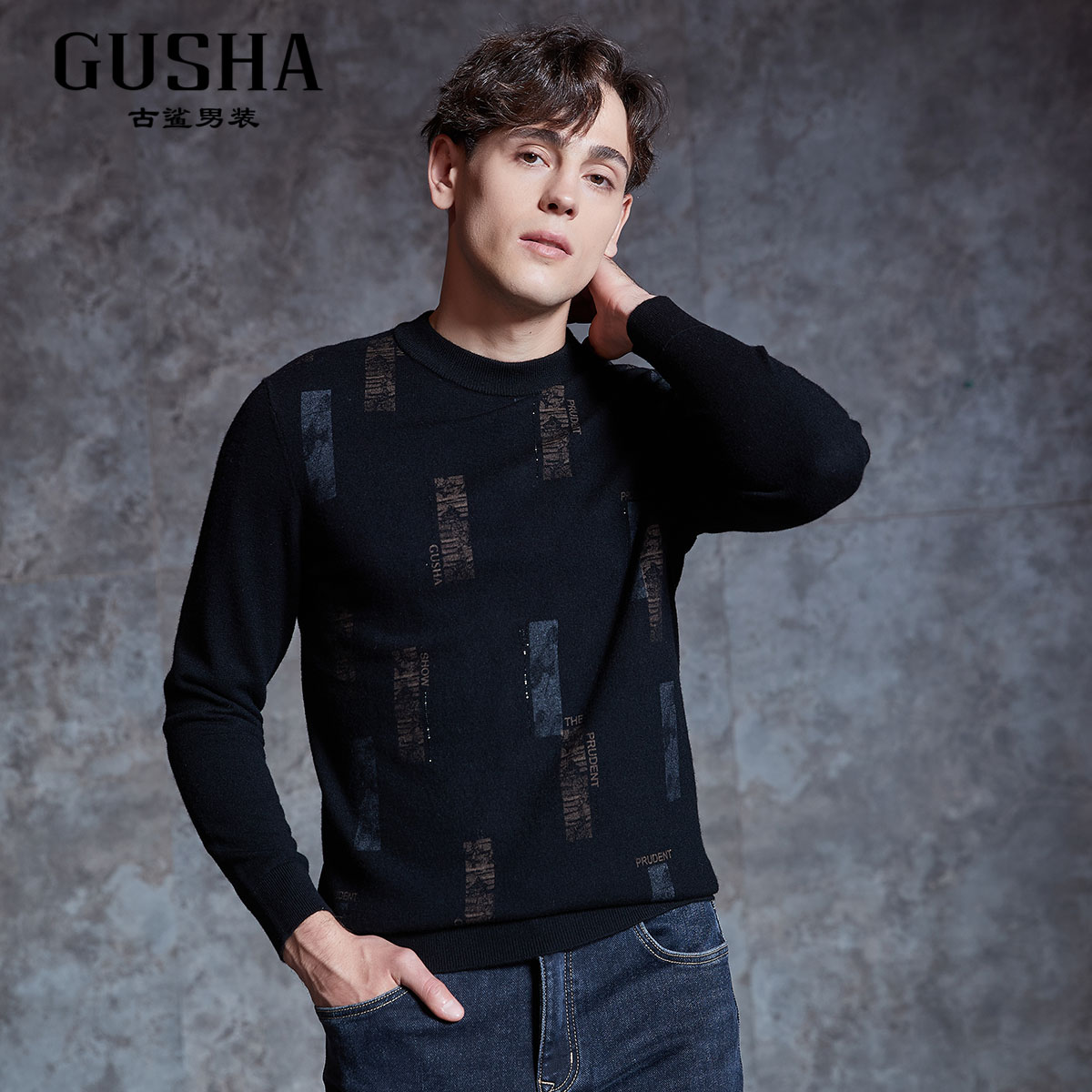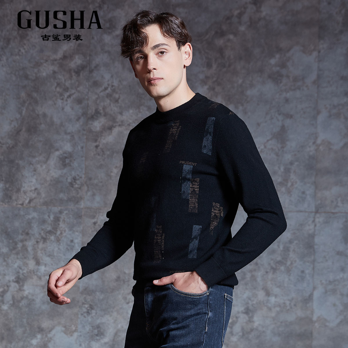 【清仓】古鲨男冬季新款黑色保暖舒适绵羊毛衫拼块山羊绒衫毛衣