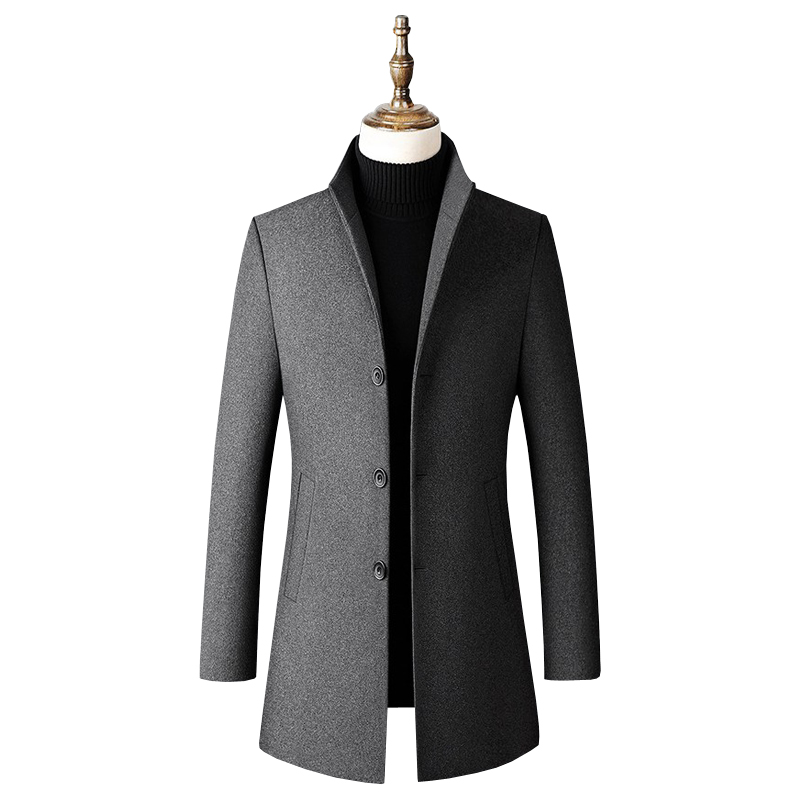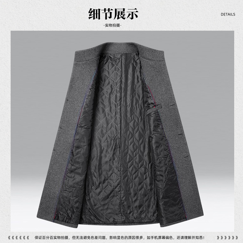 笔挺立领三粒扣中长款灰色羊毛呢子大衣秋冬夹棉风衣外套男上衣帅