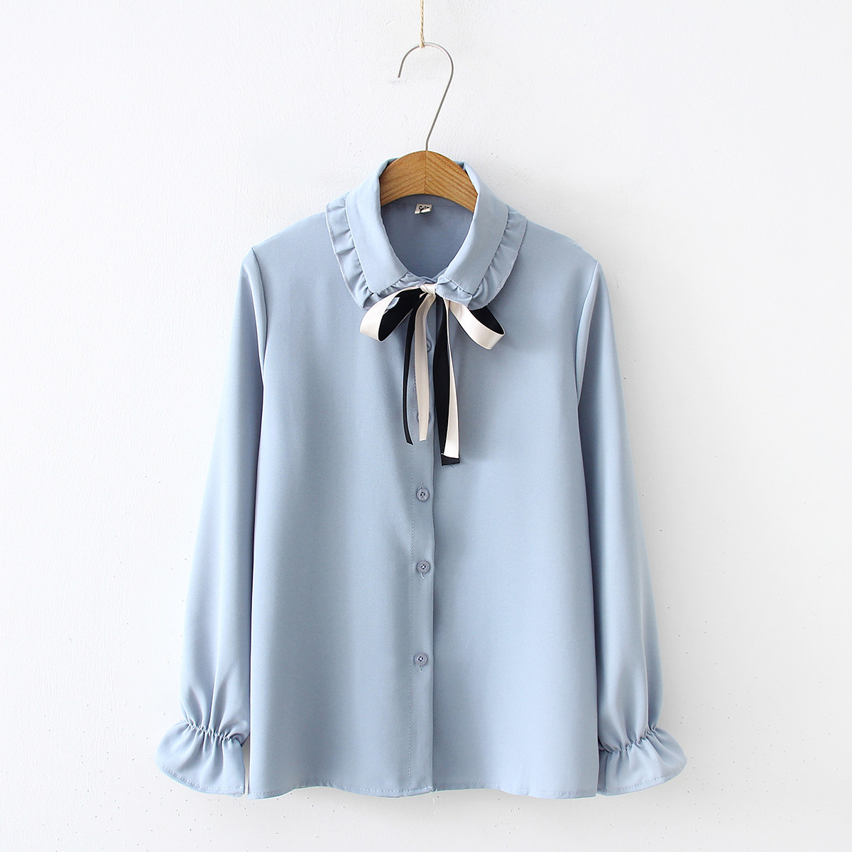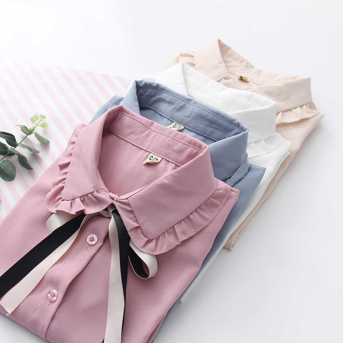 2020春季新品雪纺衫韩版甜美白衬衫娃娃领系带木耳边长袖均码纯色