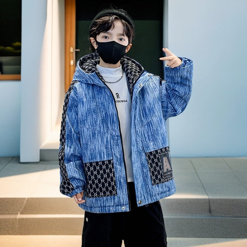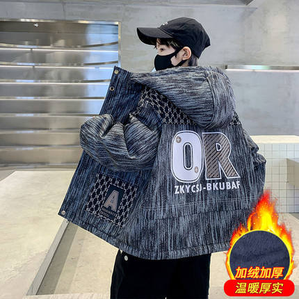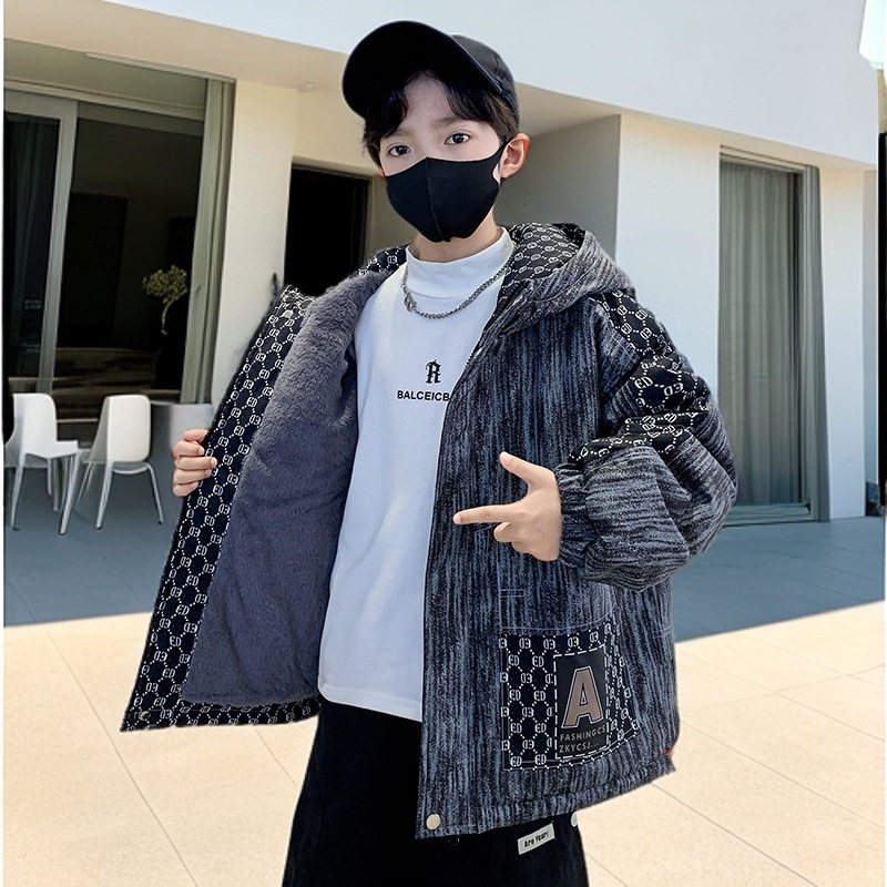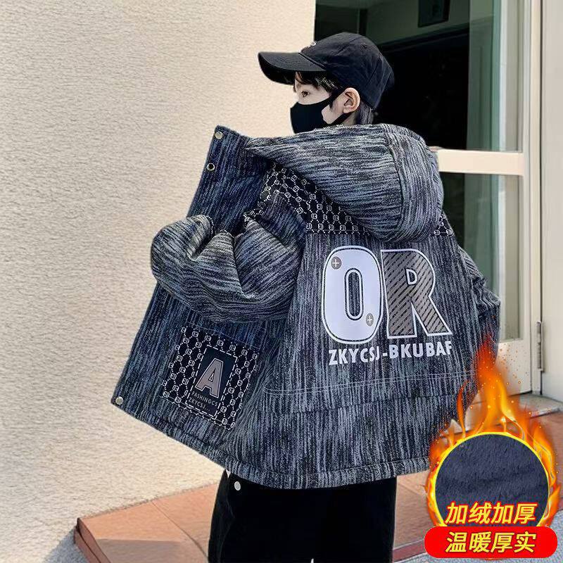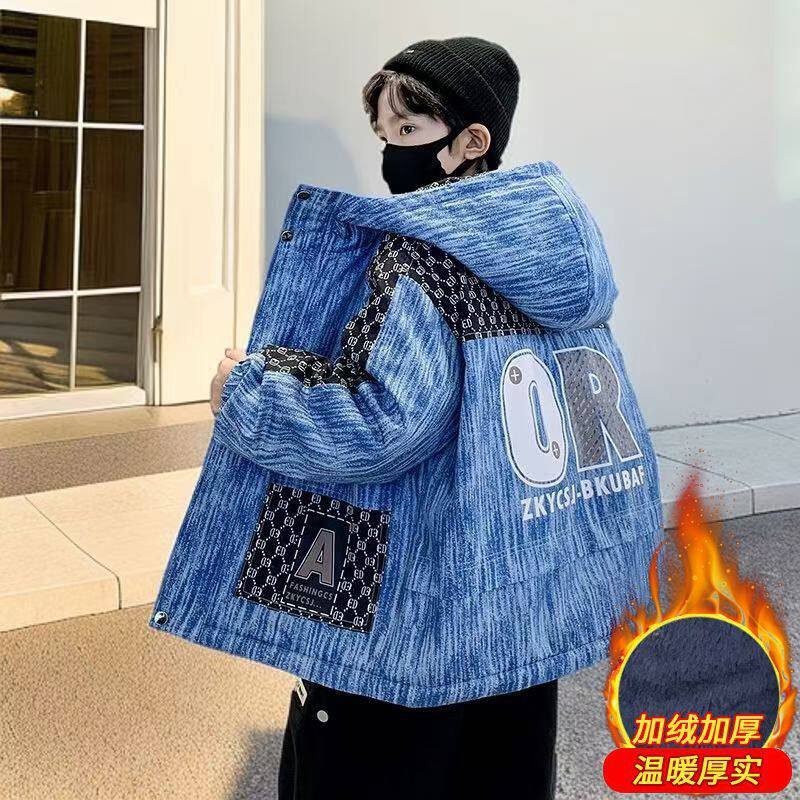 男童加绒外套秋冬款2024新款洋气中大童冬季加绒加厚儿童连帽