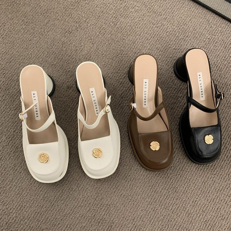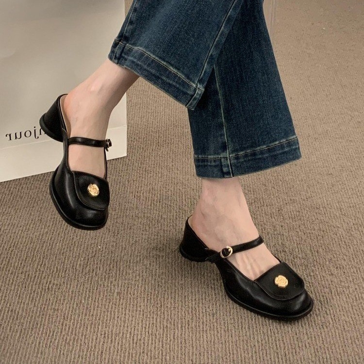 高跟包头拖鞋女外穿2025新款春夏季粗跟法式复古玛丽珍半拖穆勒鞋