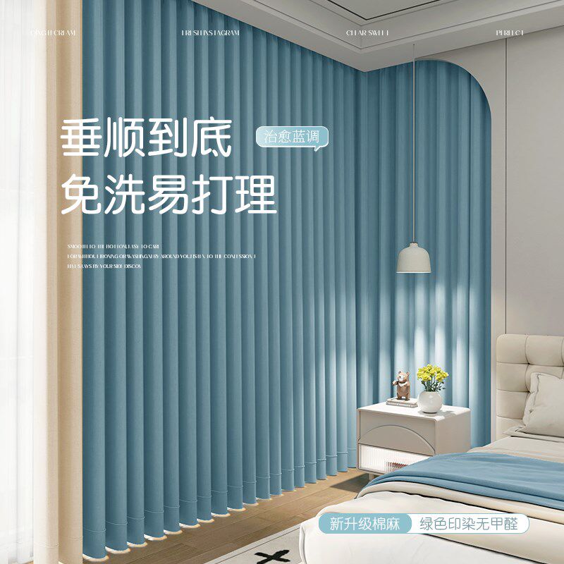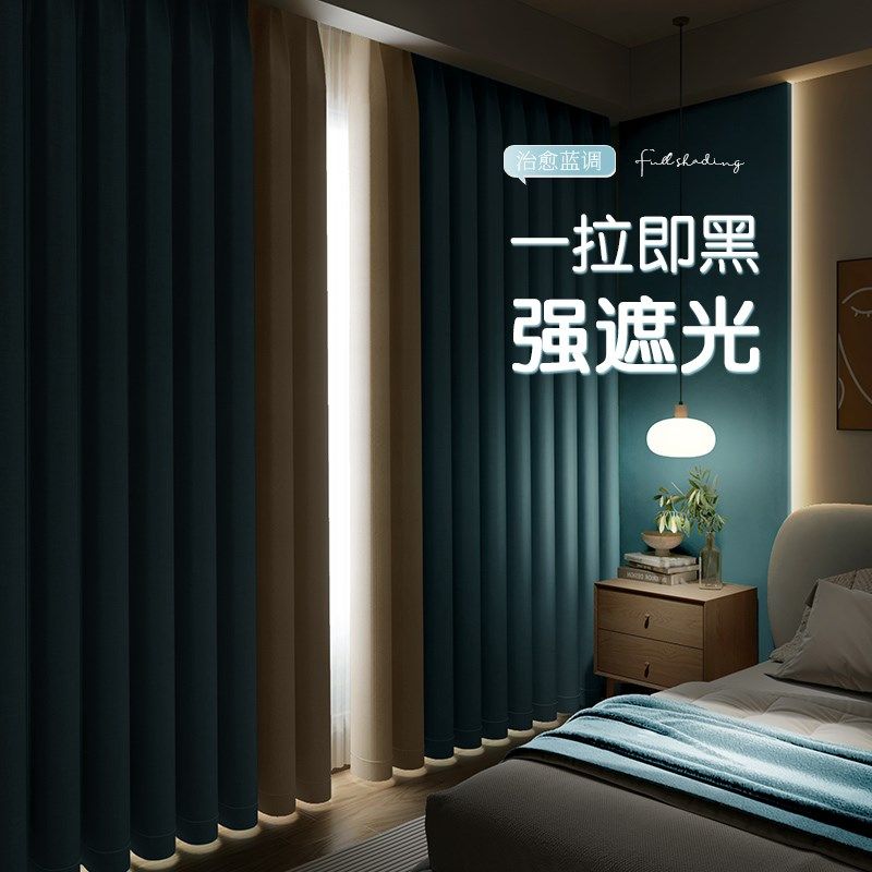 小窗户飘窗窗帘遮光2024新款卧室挂钩式轨道一整U套简约蓝色免打