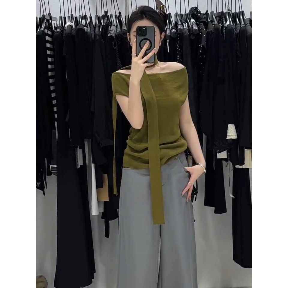 2025年新款气质一字肩针织衫女夏季新款修身显瘦短款纯欲露肩上衣