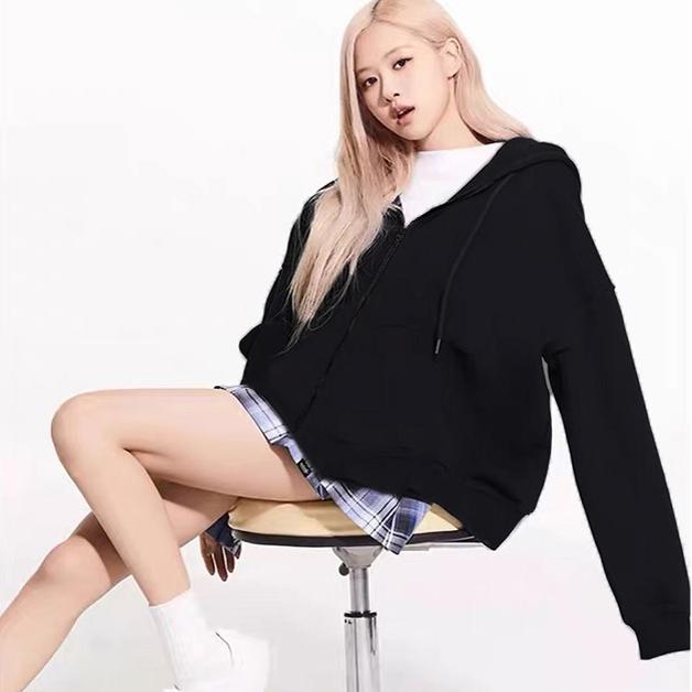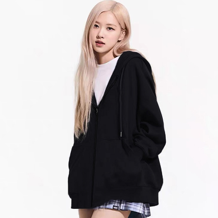 rose明星同款拉链连帽卫衣女2025新款黑色秋冬季美式开衫宽松外套