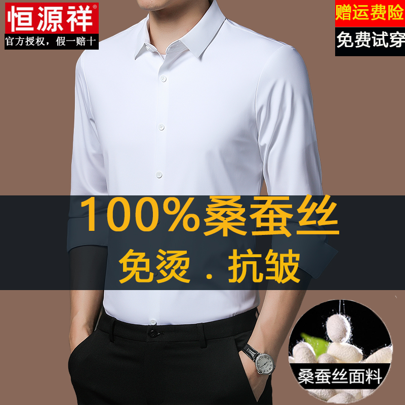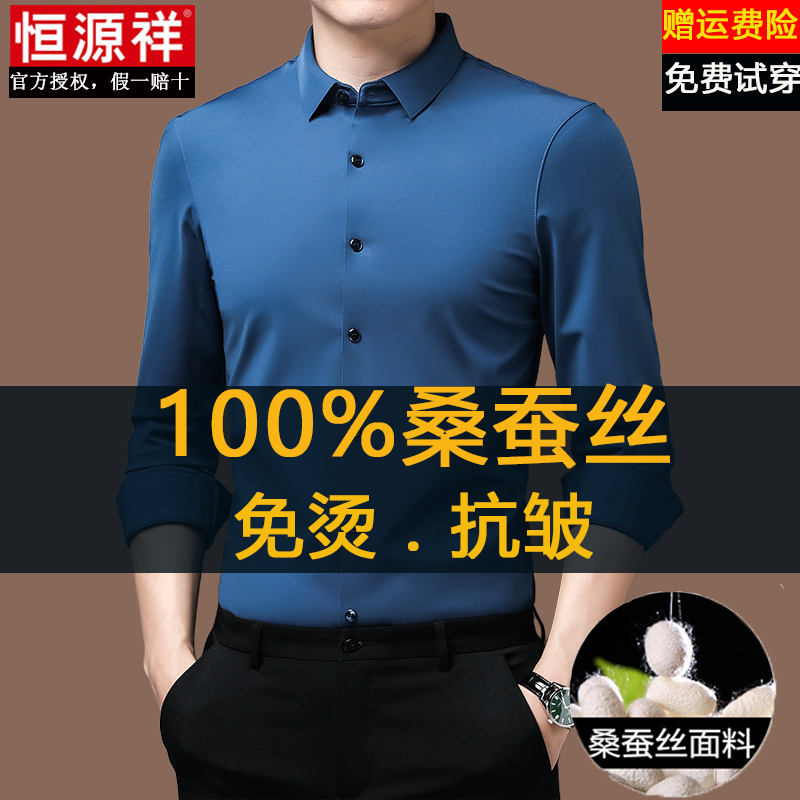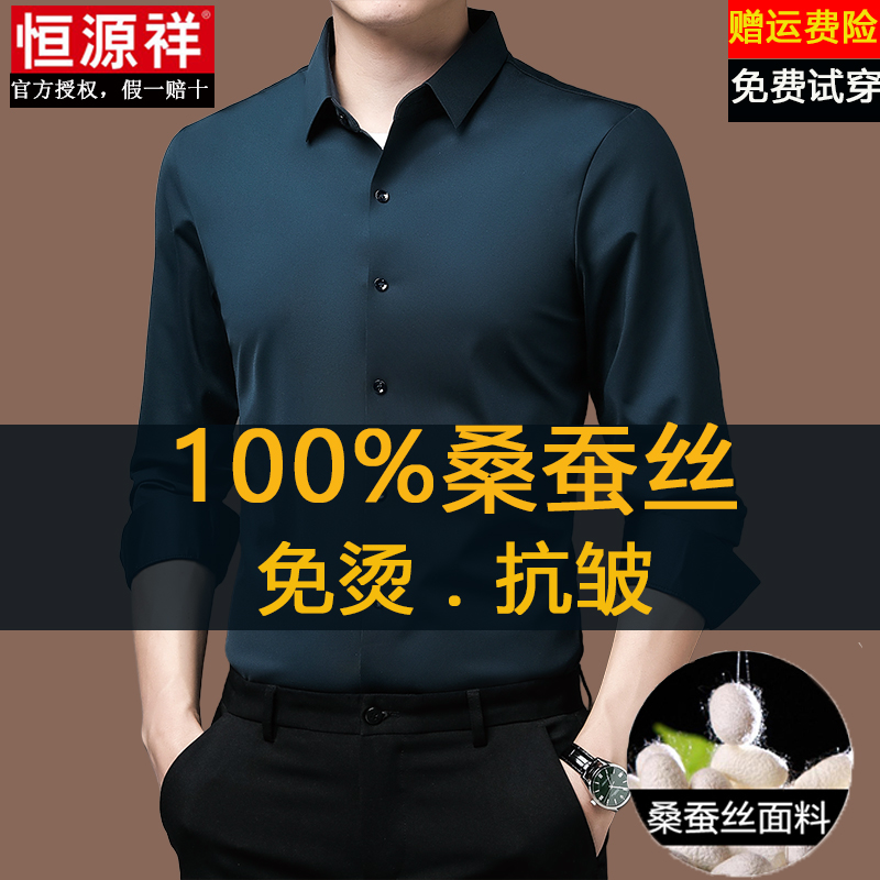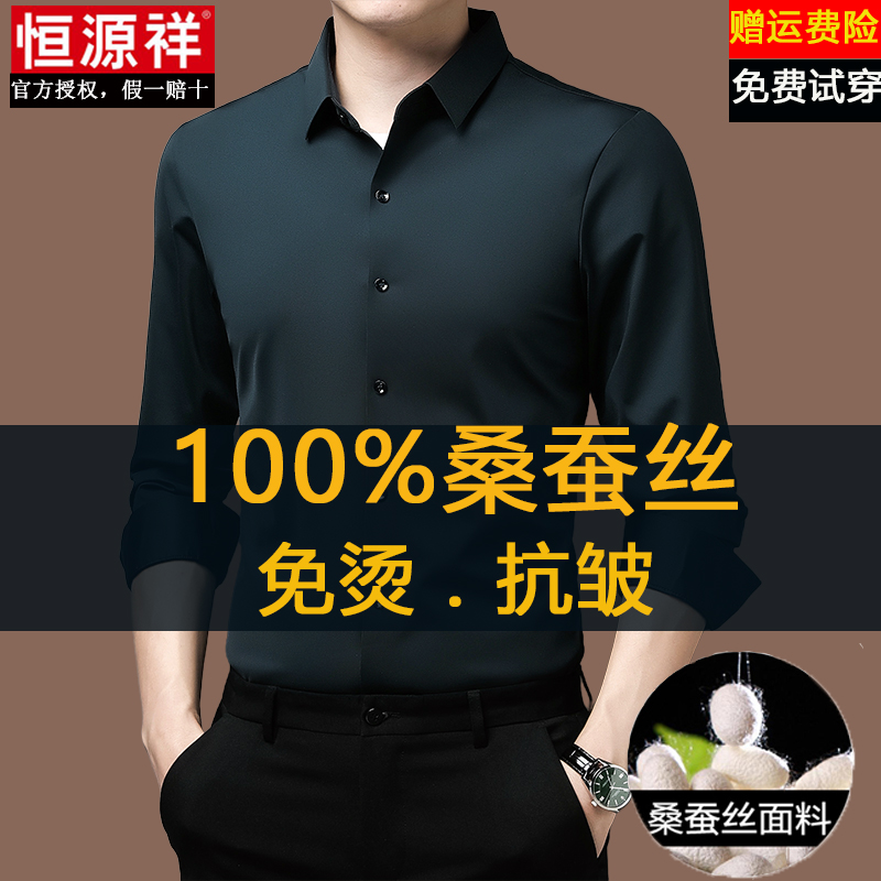 恒源祥100%桑蚕丝衬衫男长袖春秋季2025新款纯色商务休闲免烫衬衣