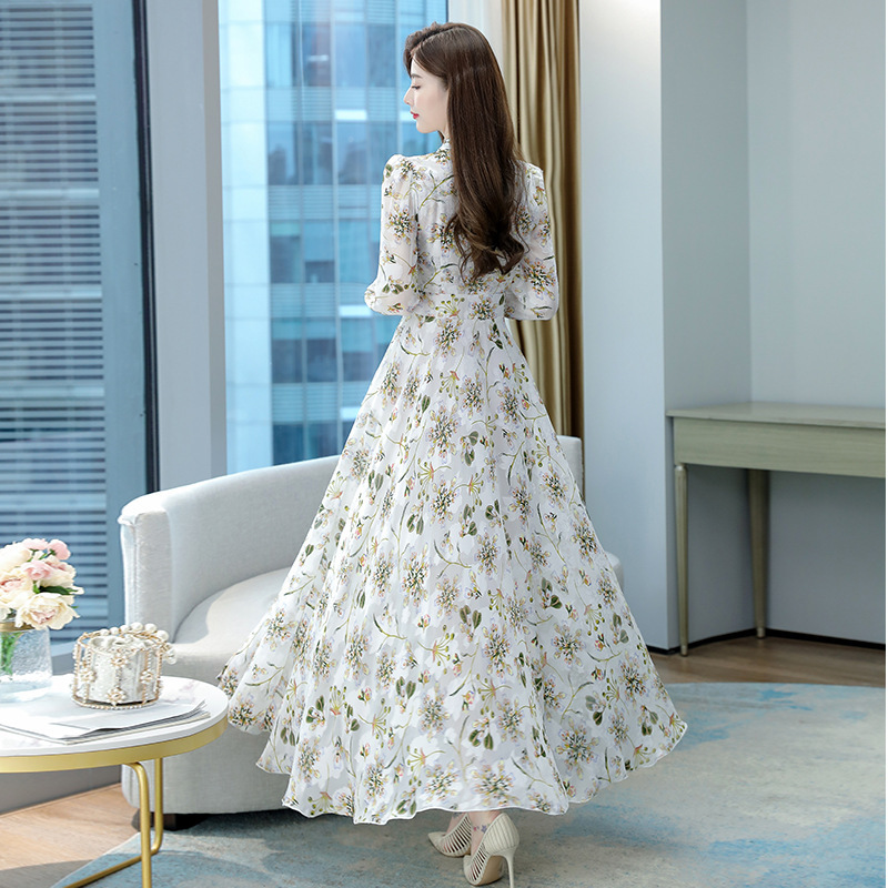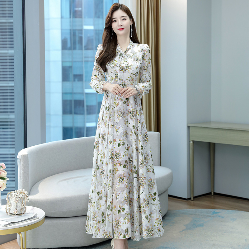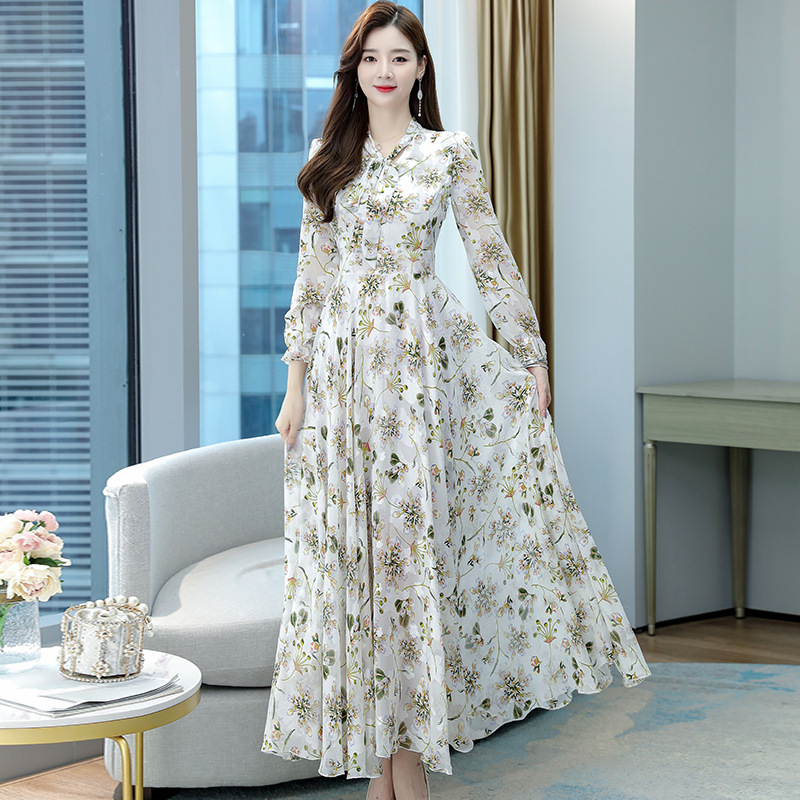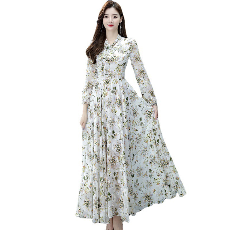 2025春秋女长袖连衣裙提花雪纺超仙收腰沙滩大摆蝴蝶结超长裙