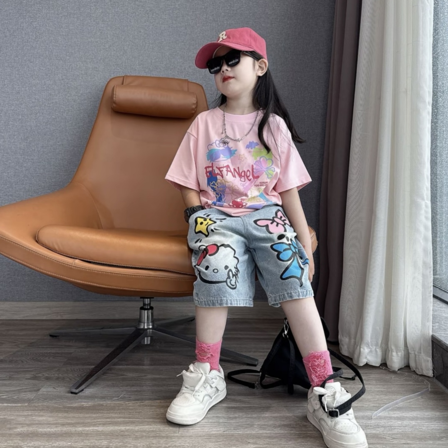 女童夏季时髦洋气涂鸦牛仔七分裤中大童韩版宽松短袖T恤两件套潮