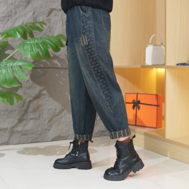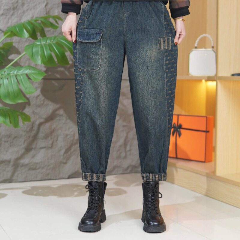春款高腰时尚大码牛仔裤宽松女裤高弹松紧腰显瘦百搭老爹裤哈伦裤