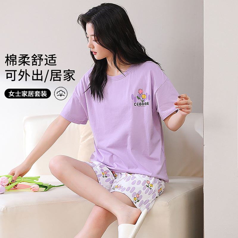 弘丹芬新款女纯棉加胸垫短裤短袖学生甜美宽松可外穿睡衣