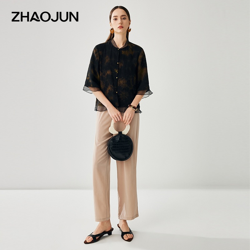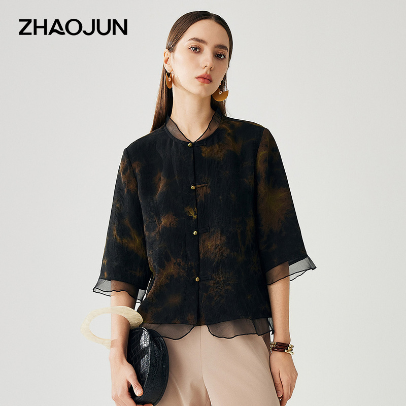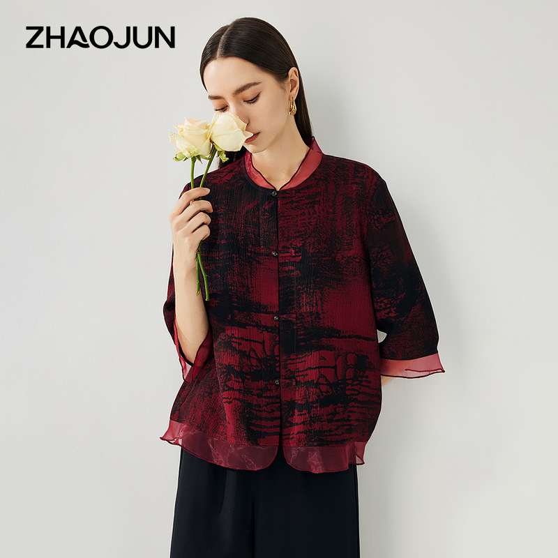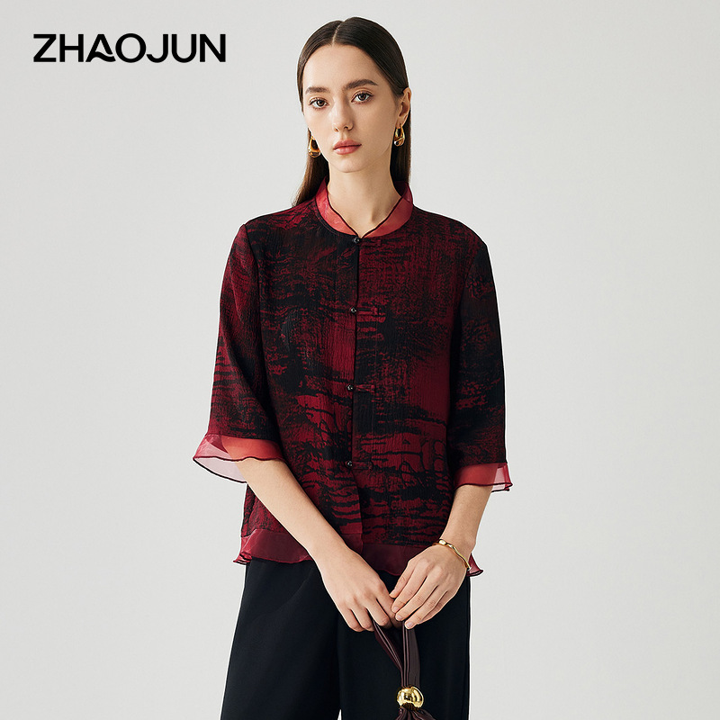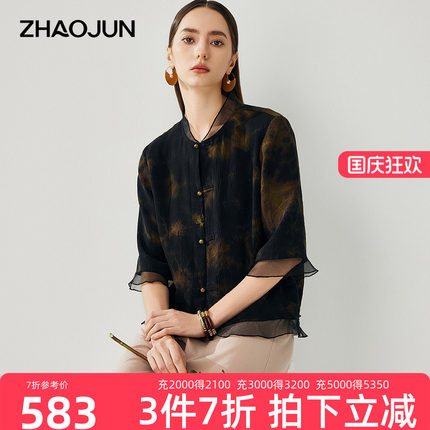 兆君2025春夏新款重磅桑蚕丝印花上衣香云纱真丝七分袖宽松女装