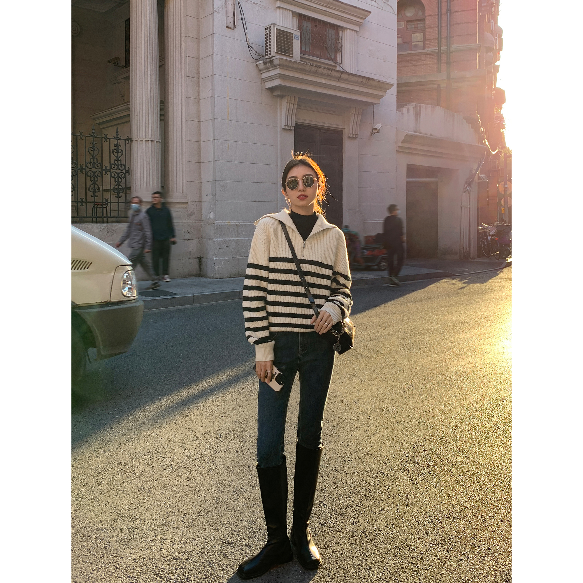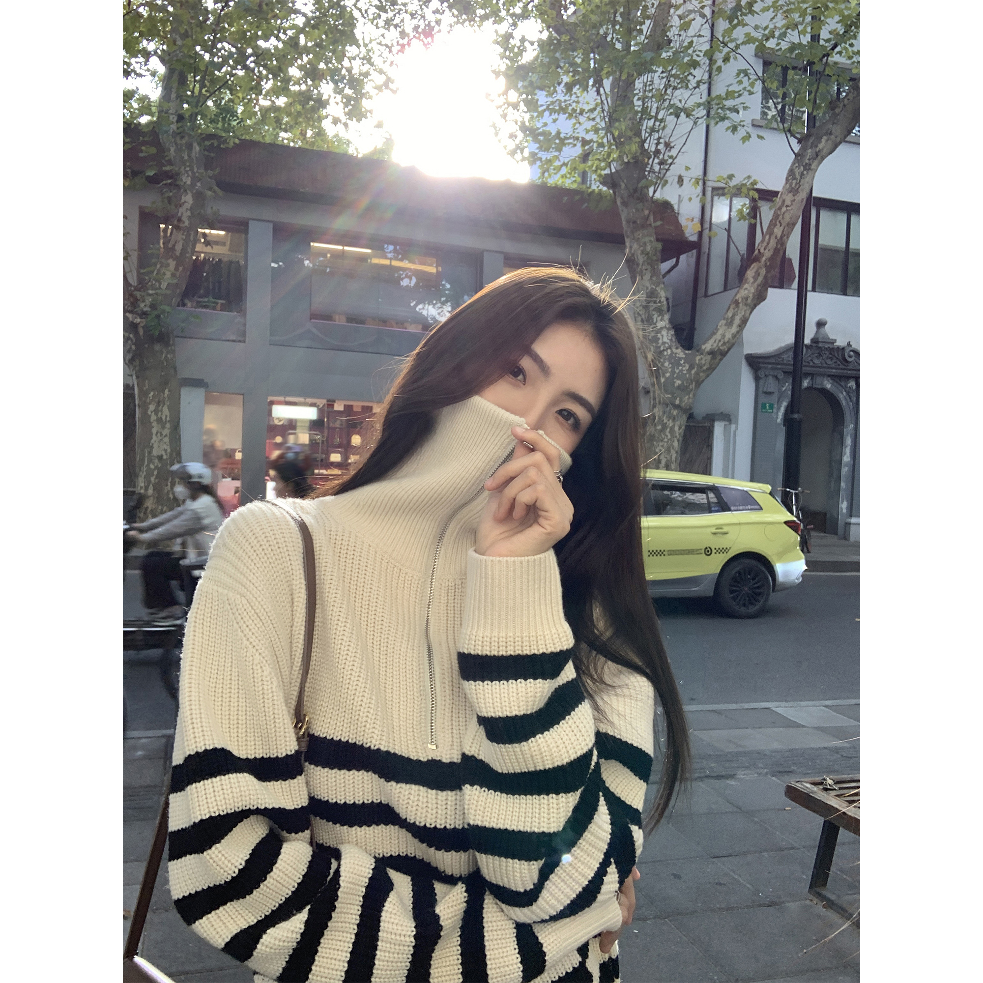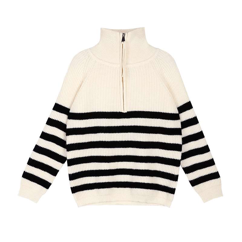 韩系慵懒风半拉链条纹毛衣外套