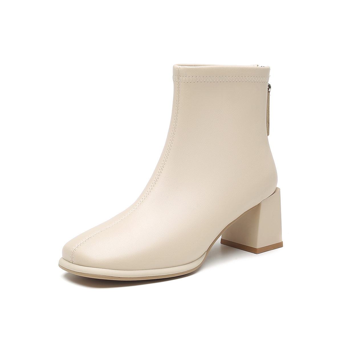 大东白色短靴女2025新款秋冬加绒方头粗跟高跟靴法式靴子切尔西靴
