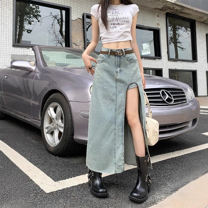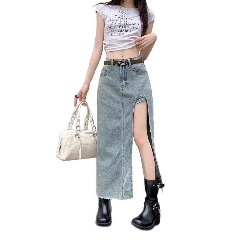 显瘦侧做旧牛仔半身裙A夏季洗水辣妹中长裙女字包臀高腰开叉复古