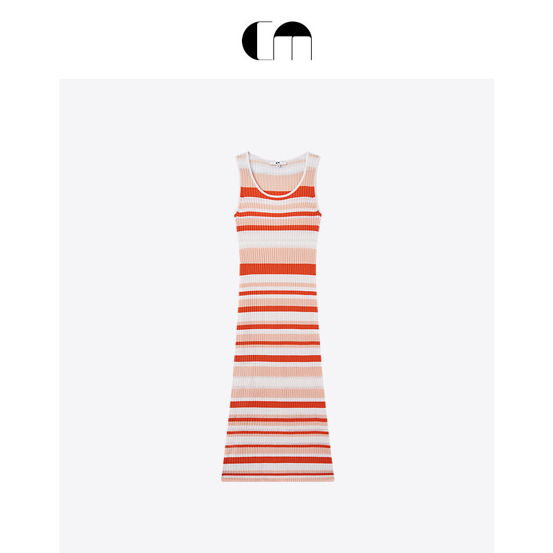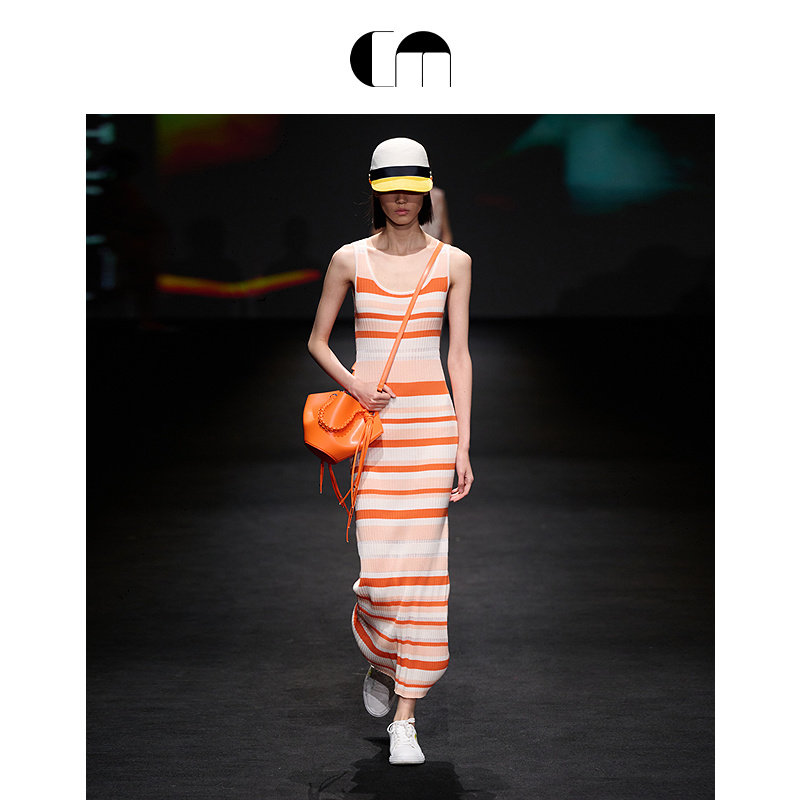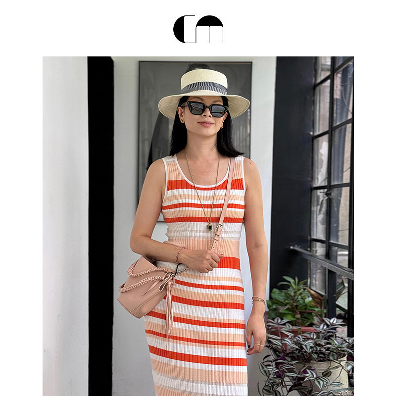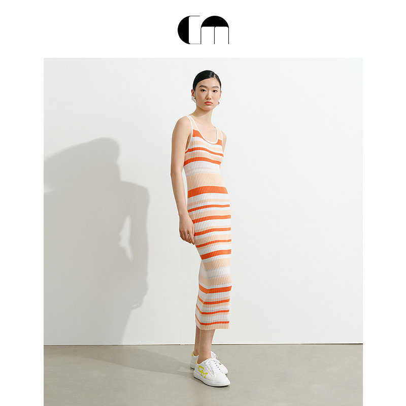 明星同款系列 COMME MOI吕燕设计师早春羊毛U领条纹紧身连衣裙