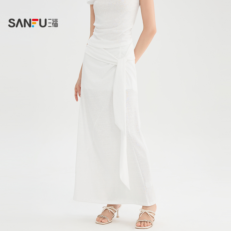 三福白色套装2025新款夏季时尚高级气质斜肩短袖半身裙两件套女装