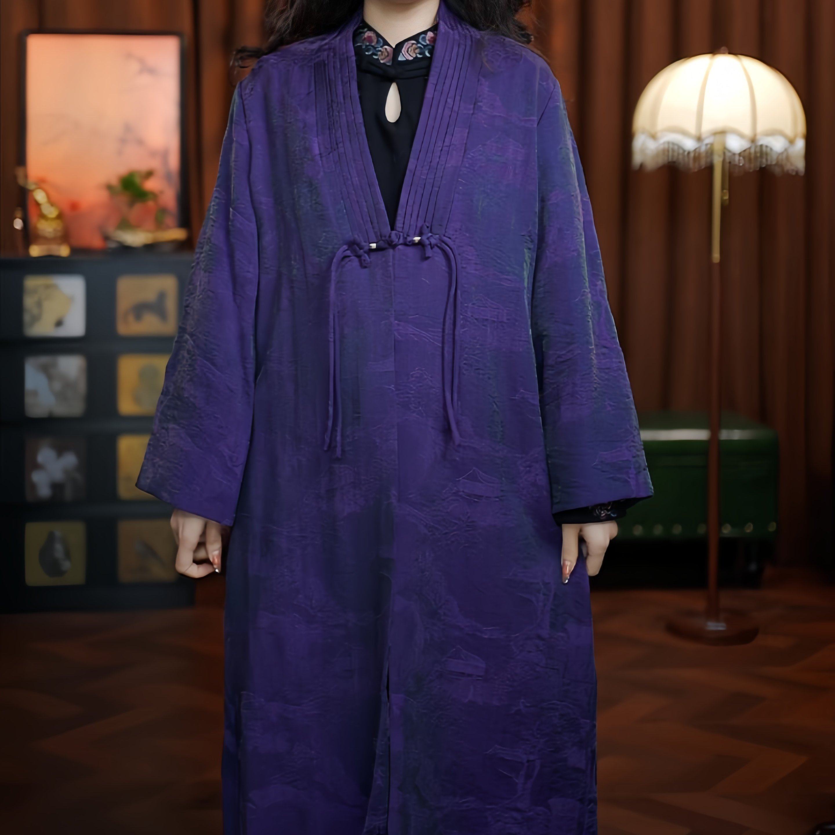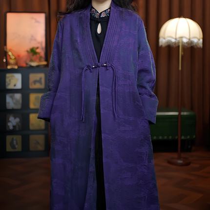 南枝独翘(紫色)盘扣长袖老料提花风衣女装长款开衫外套
