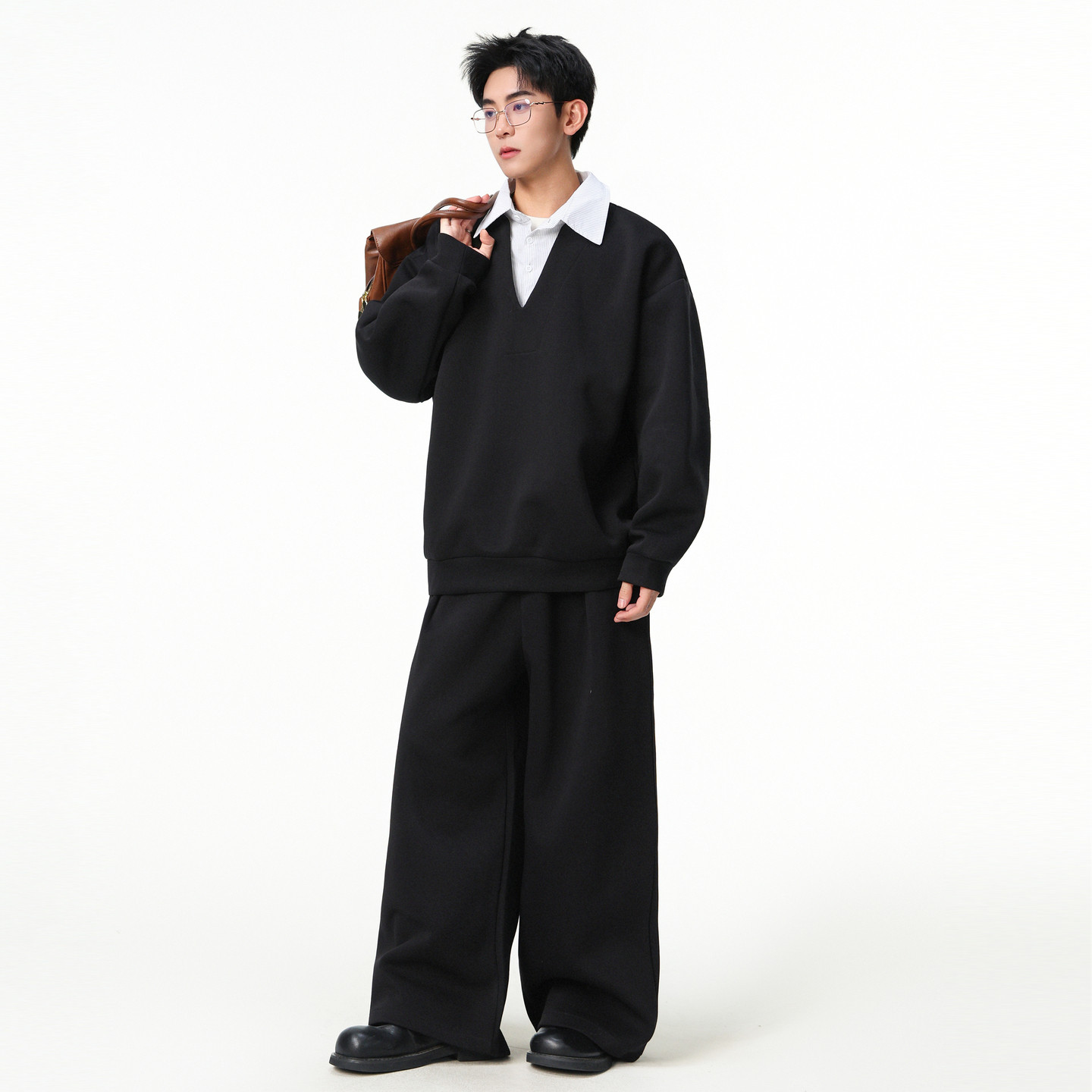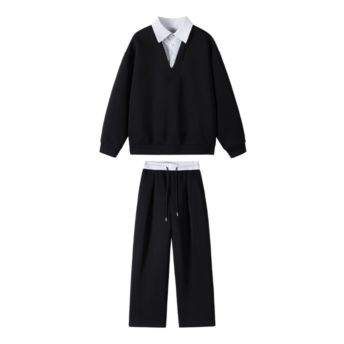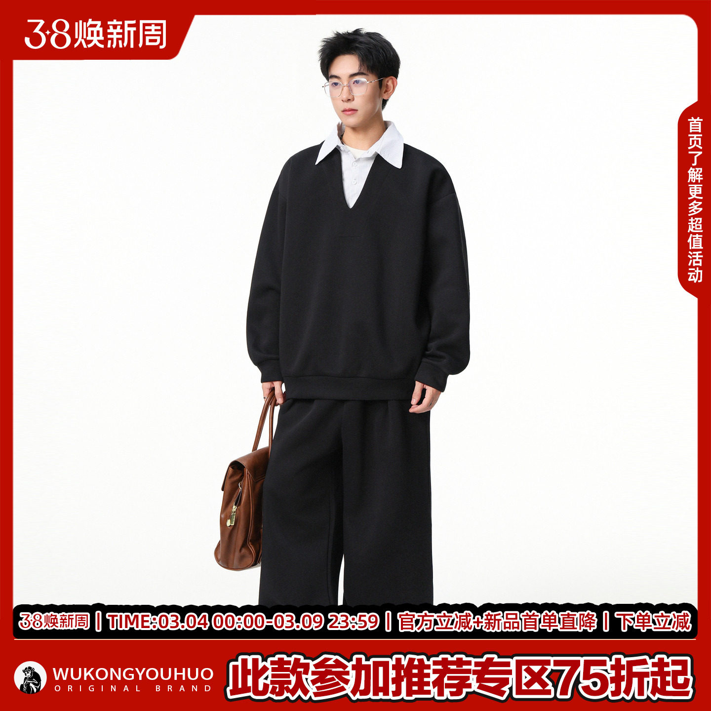 悟空有货假两件条纹衬衫领套头卫衣休闲套装男春秋宽松百搭两件套