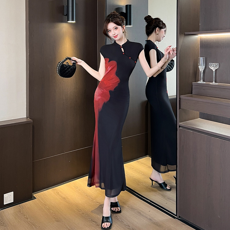 春季小个子女装加小码XXXS150cm显高撞色旗袍连衣裙网纱背心收腰