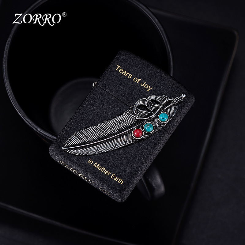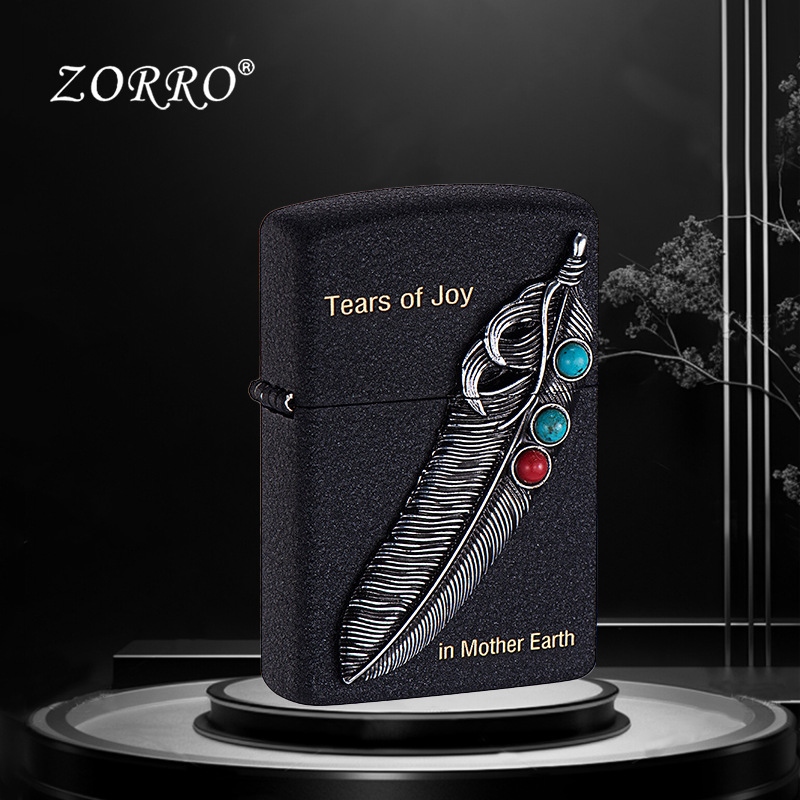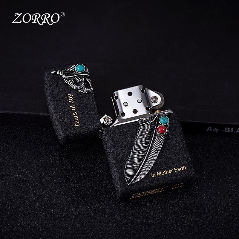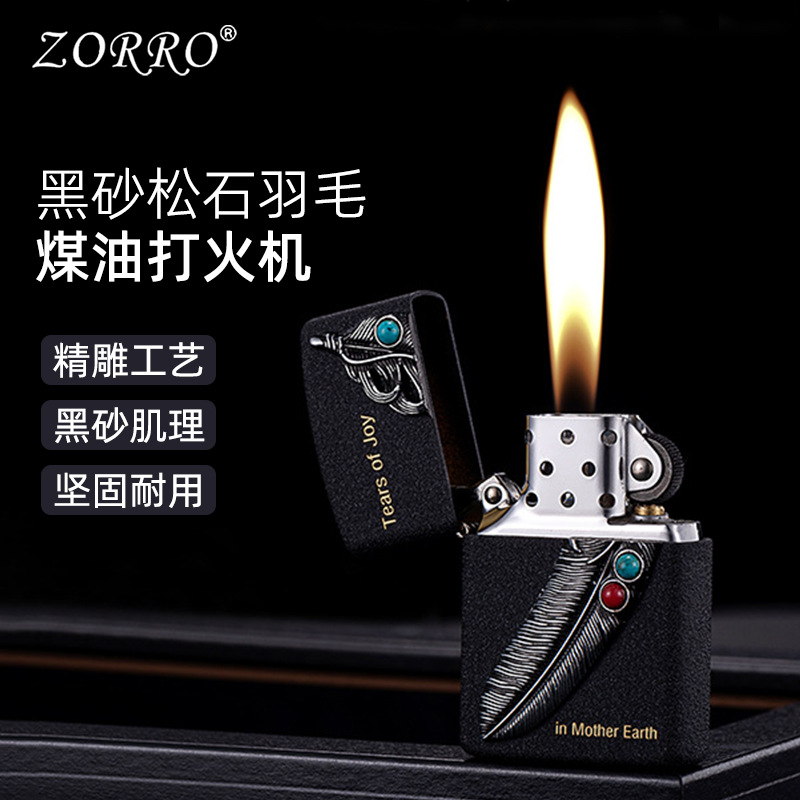 zorro佐罗正品砂轮煤油打火机铜壳皱纹漆磨砂贴章彩松石羽毛文字