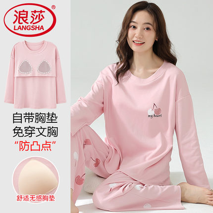 浪莎2026年新款睡衣带胸垫女款春秋季纯棉长袖秋冬甜美减龄家居服
