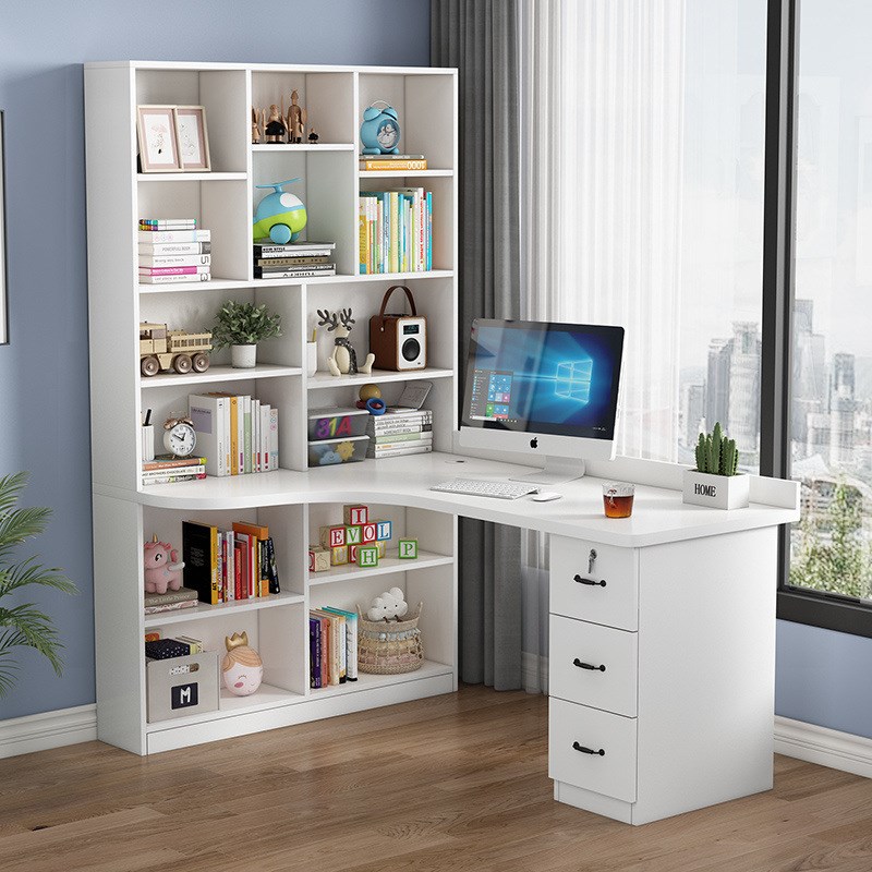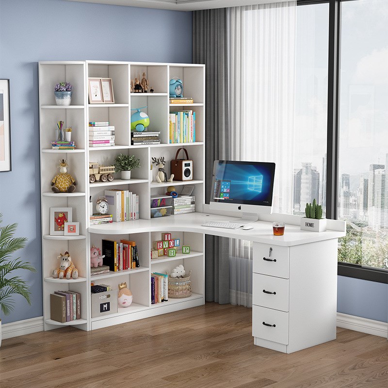 实木转角电脑桌书桌书架组合台式写字桌带书柜家用儿童卧室学习桌