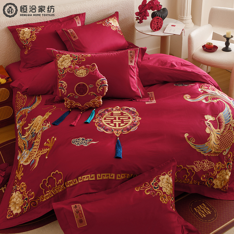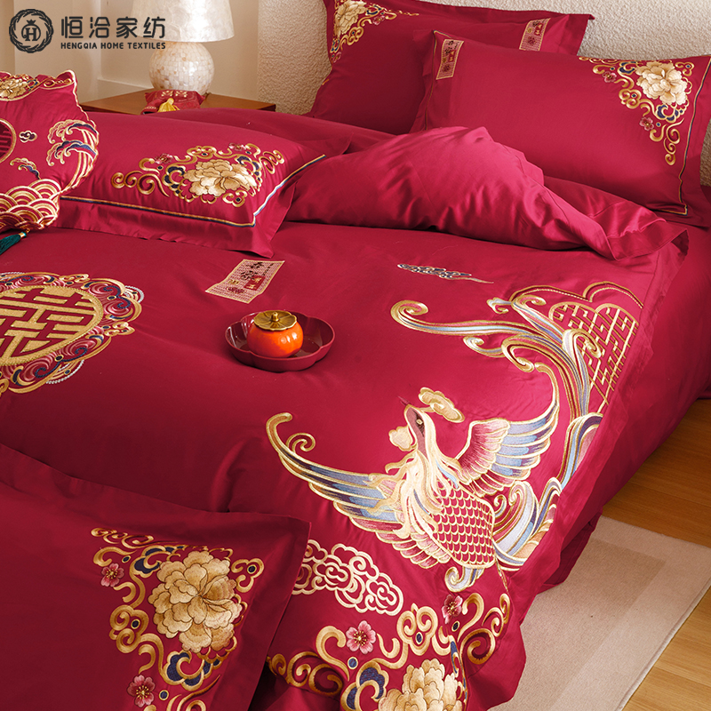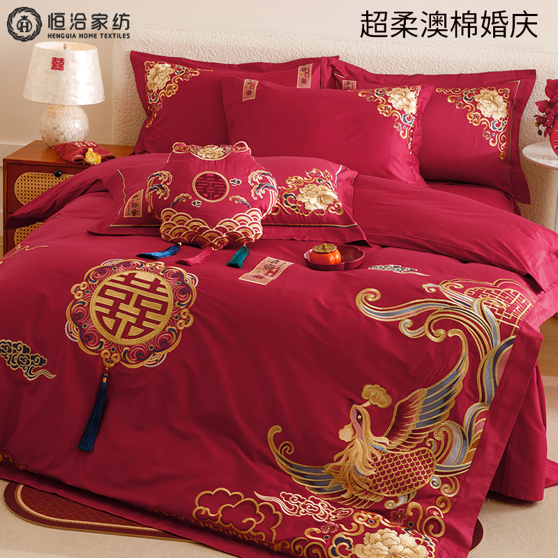 中式婚庆澳棉全棉四件套重工龙凤刺绣纯棉大红色结婚被套床上用品