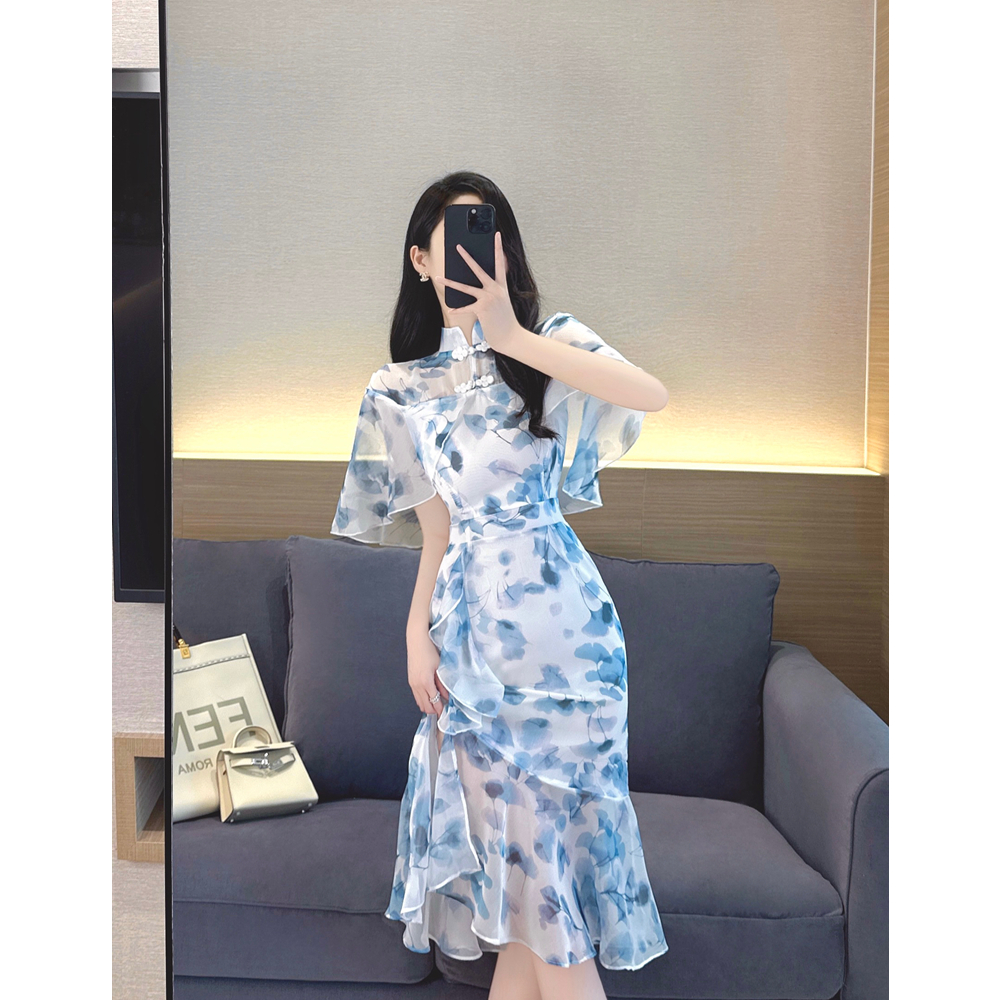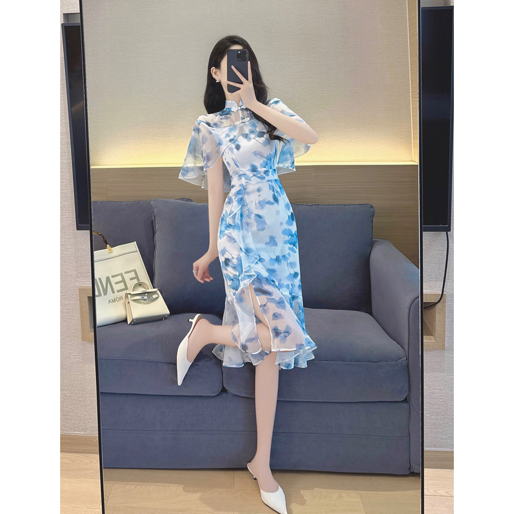 日常改良新中式旗袍裙女夏2023新款复古气质名媛中长款碎花连衣裙