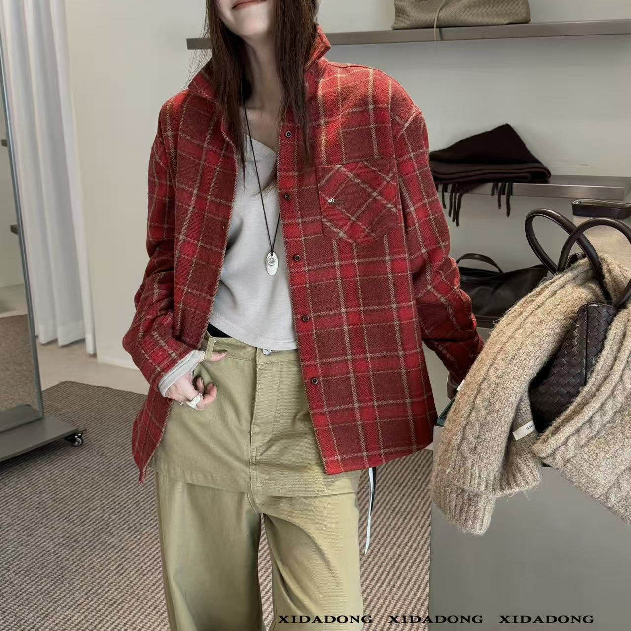 2026新款喜大东百搭休闲刺绣小狗磨毛格子衬衫宽松上衣新年款外搭