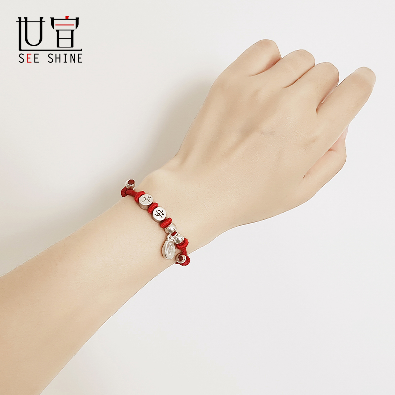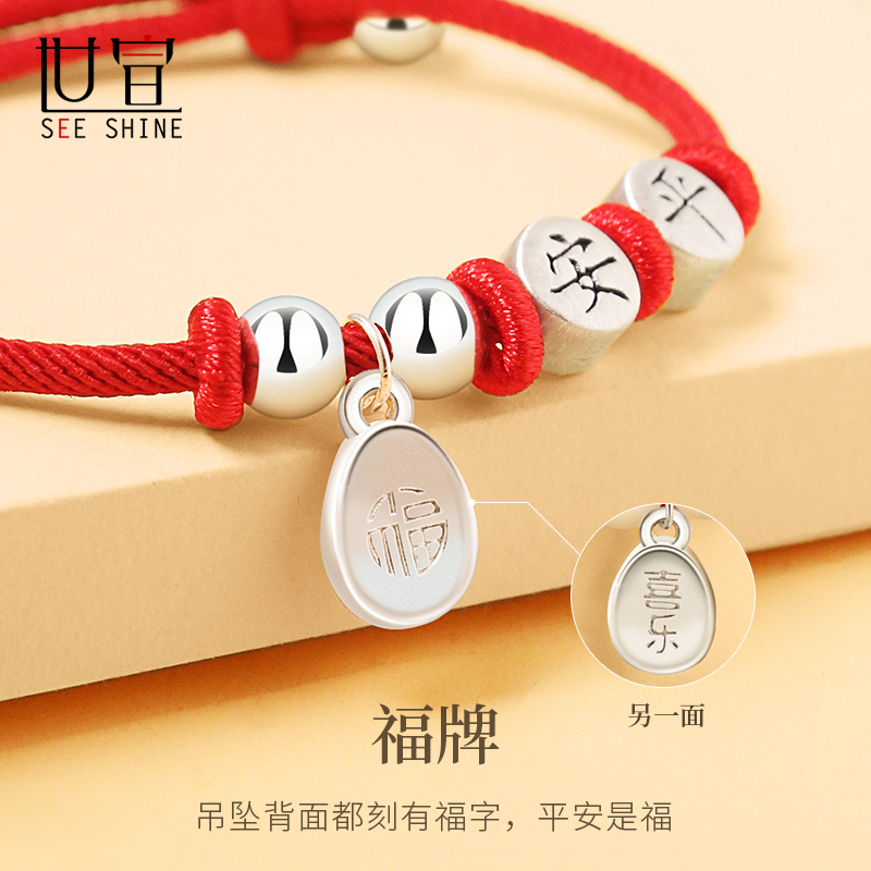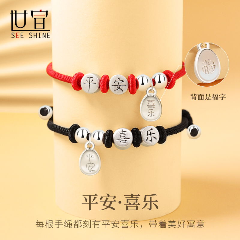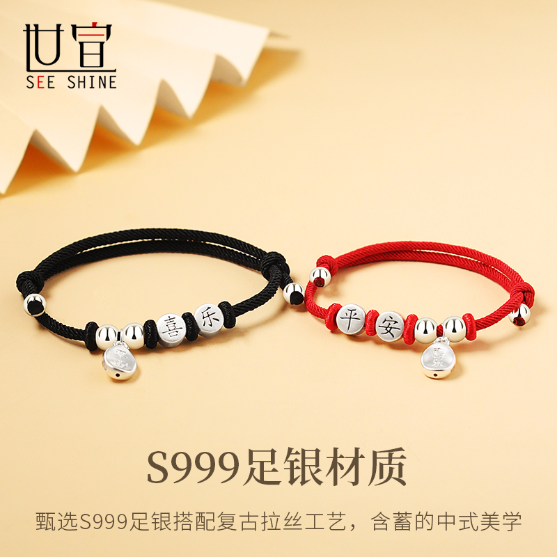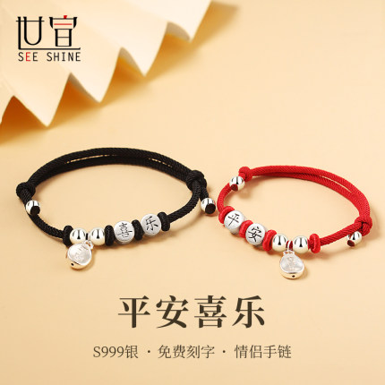 平安喜乐手链情侣款999纯银本命年手串红男女刻字手绳圣诞节礼物