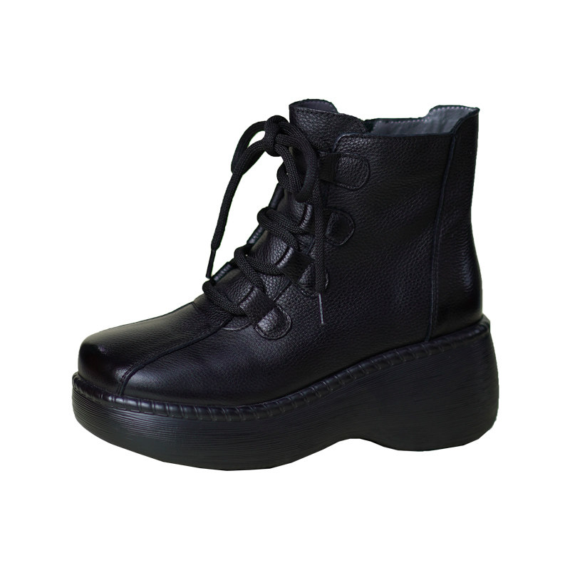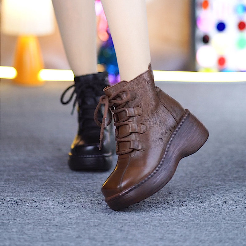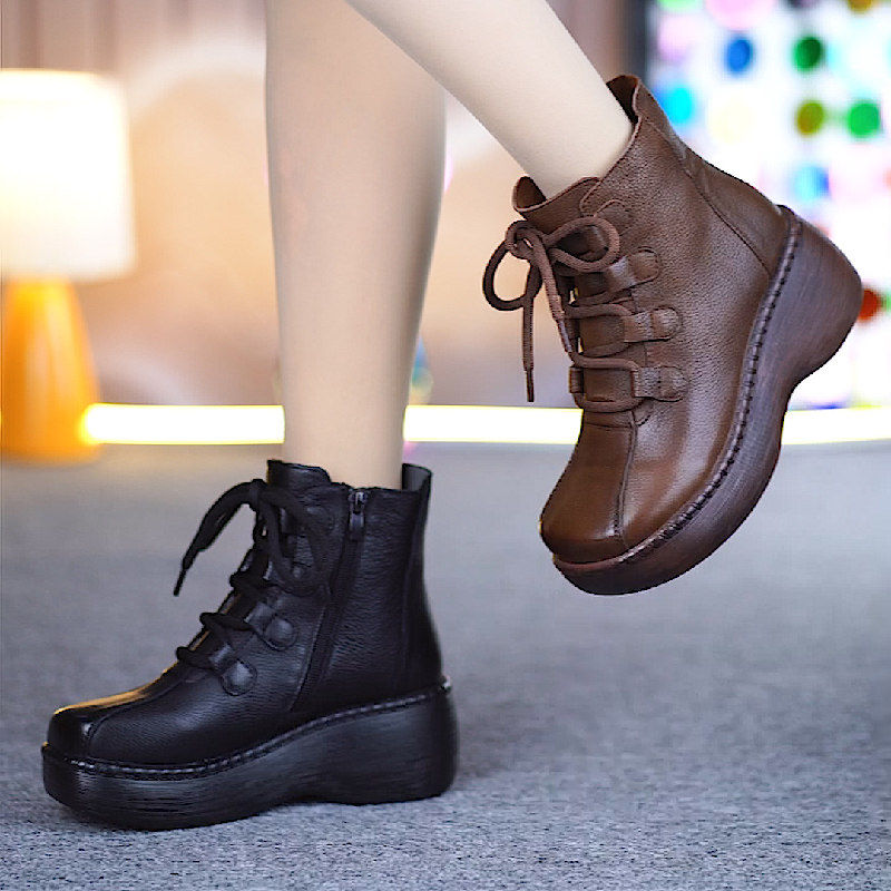 真皮厚底马丁靴女秋冬新款纯牛皮民族风圆头复古粗高跟休闲女靴