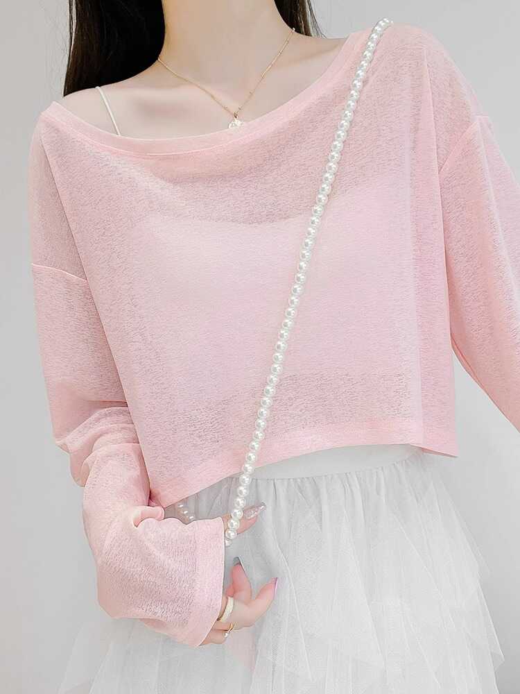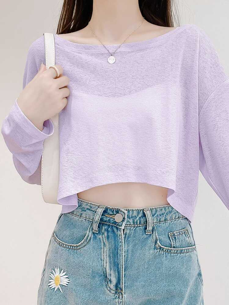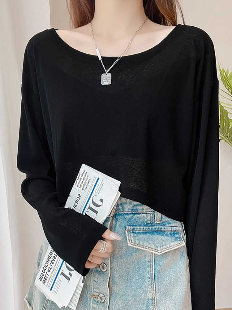 潮牌长袖t恤女夏季套头防晒罩衫大领口露锁骨宽松短款冰丝上衣薄