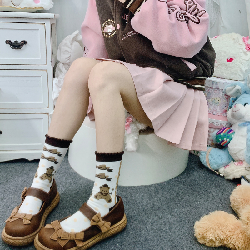 "小熊游乐园" 原创设计洛丽塔可爱棉袜卡其白色蝴蝶结少女中筒袜