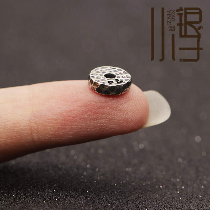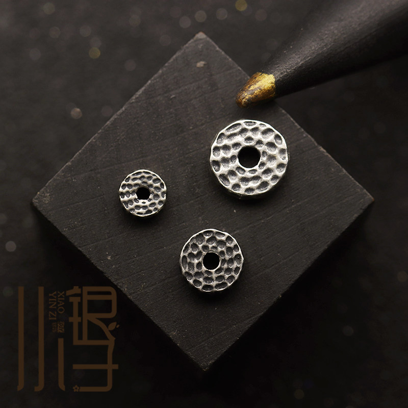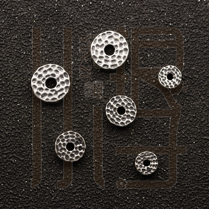 S925纯银隔珠 陨石坑敲面做旧圆片隔片无相文玩银配饰DIY男士配件