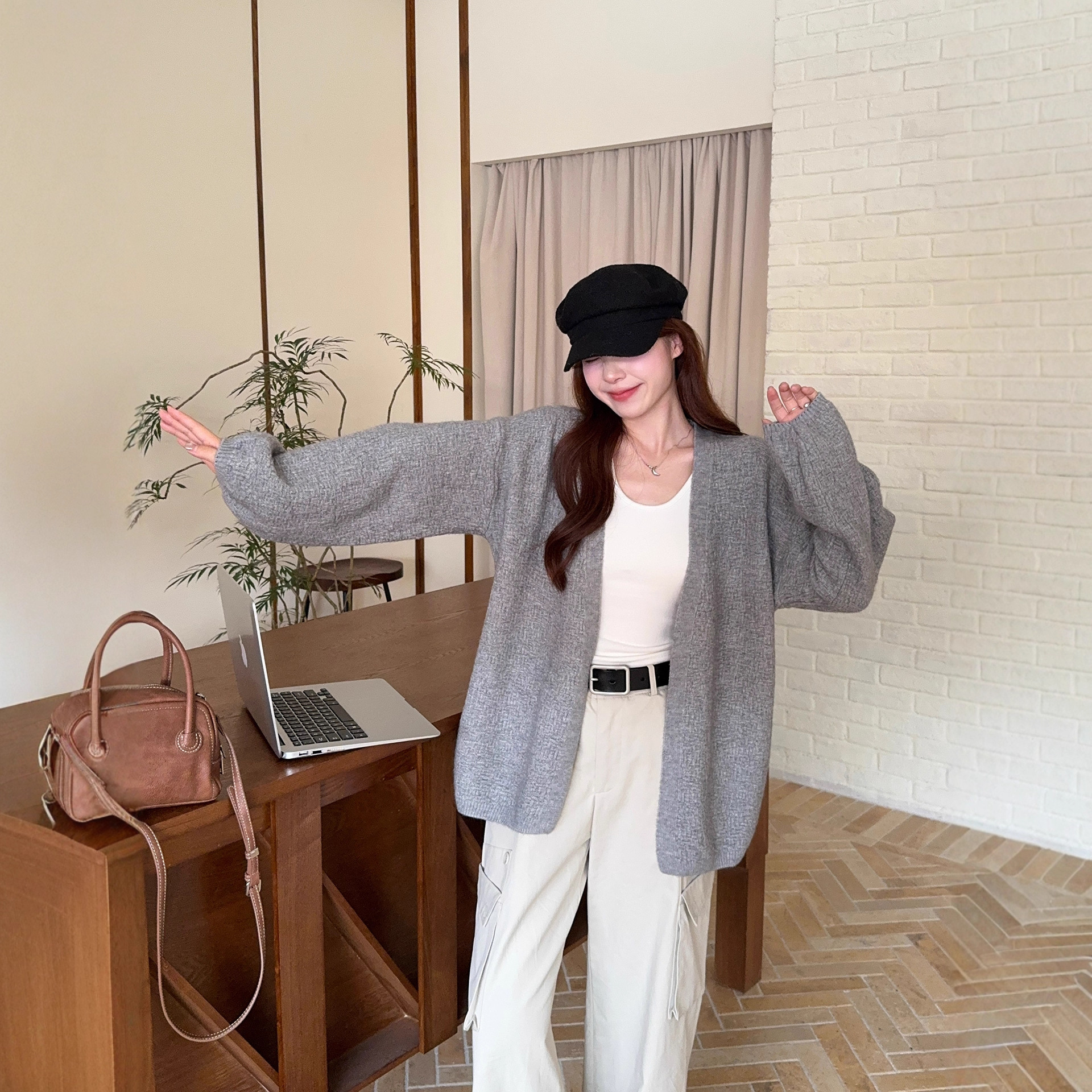 秋冬新款慵懒风树皮纹时尚百搭宽松中长款泡泡袖针织衫外套女