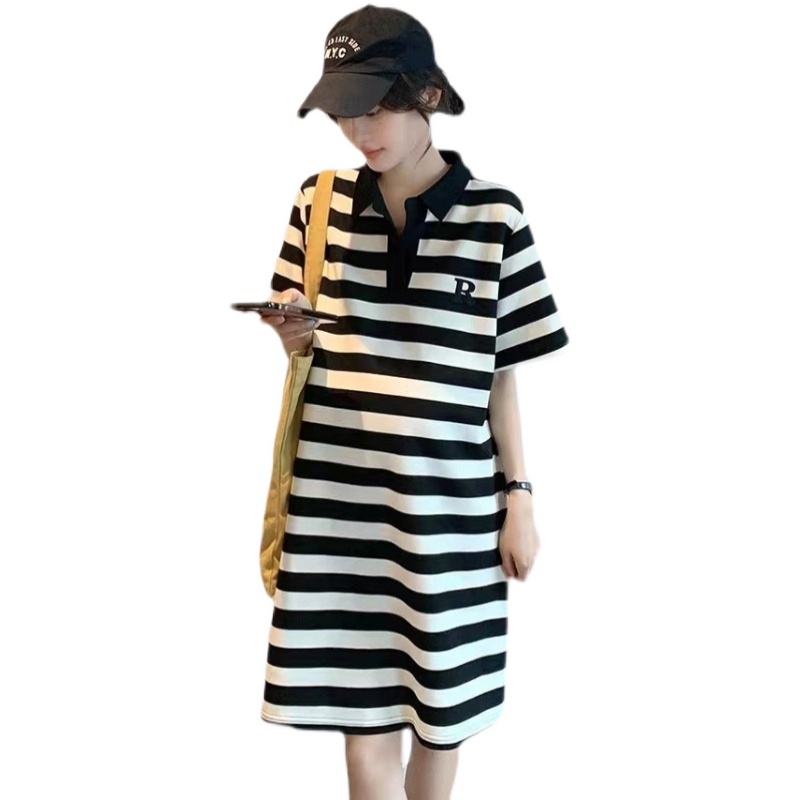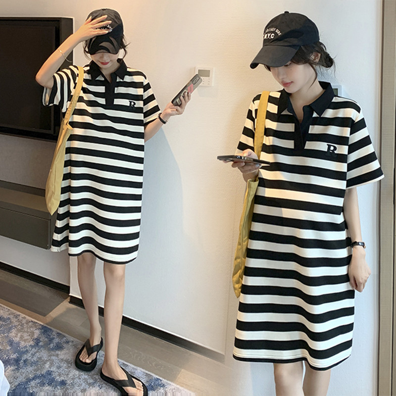 哺乳夏装孕妇装小个子大码中长款条纹连衣裙夏款翻领T恤裙子夏季