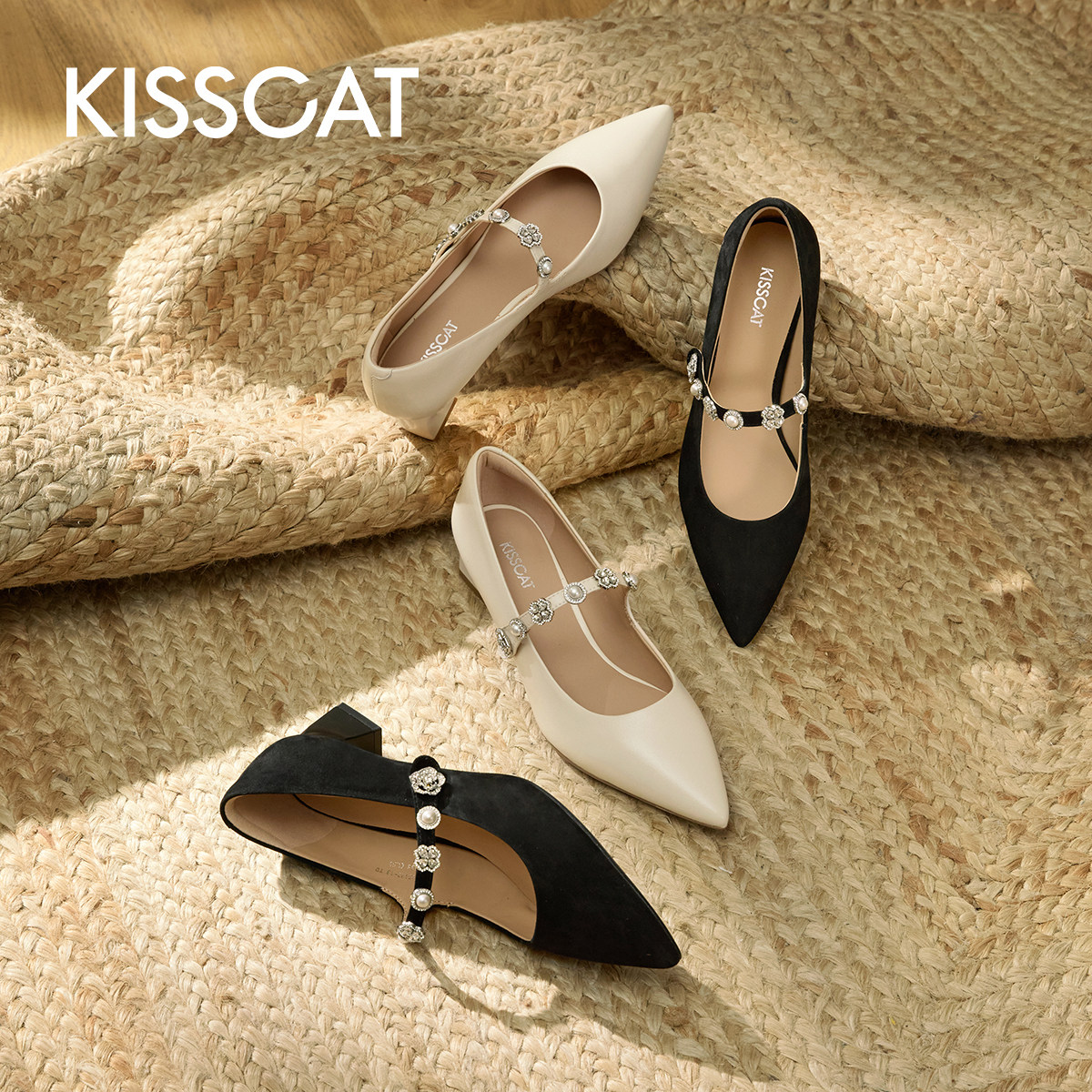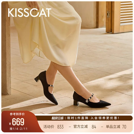 KISSCAT接吻猫[心动信号玛丽珍]舒适法式单鞋银色尖头玛丽珍鞋