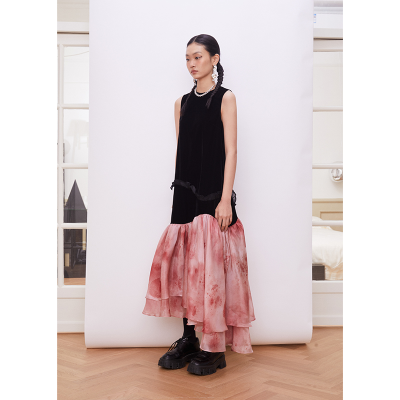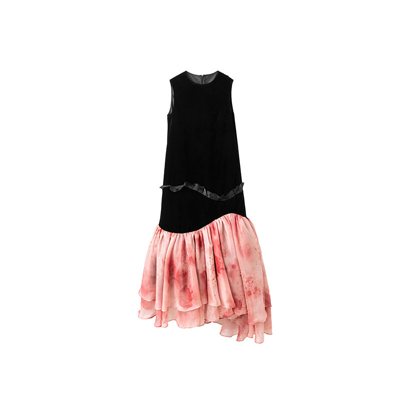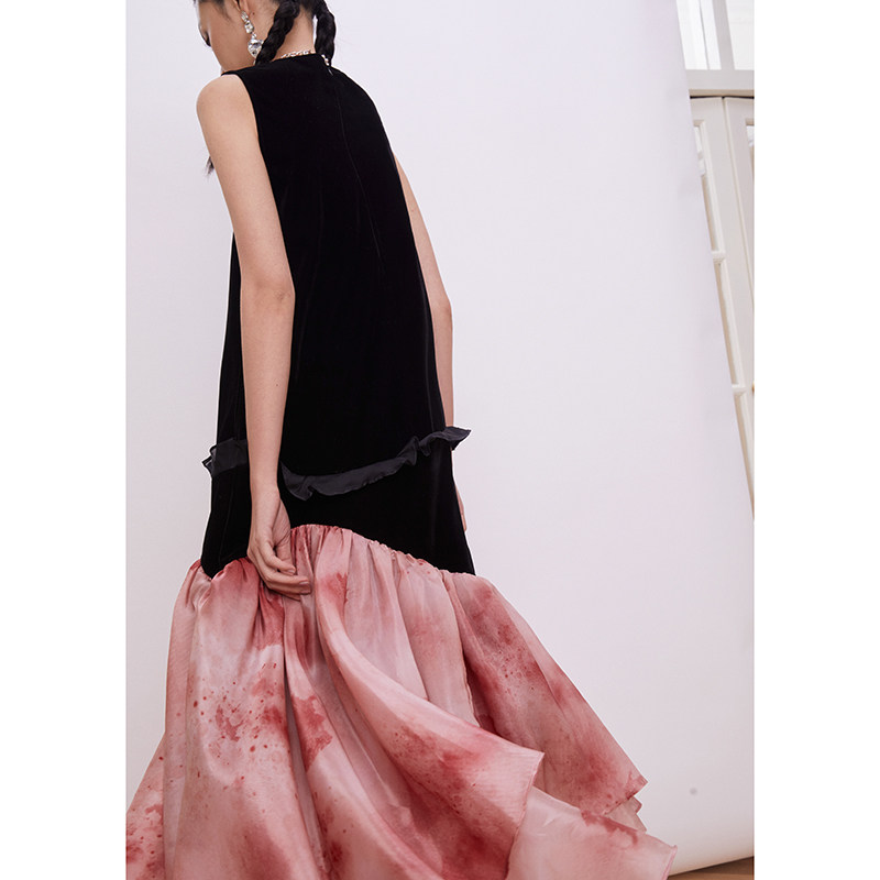 Layers 复古立体波浪大摆 玛丽红拼色无袖鱼尾裙连衣裙