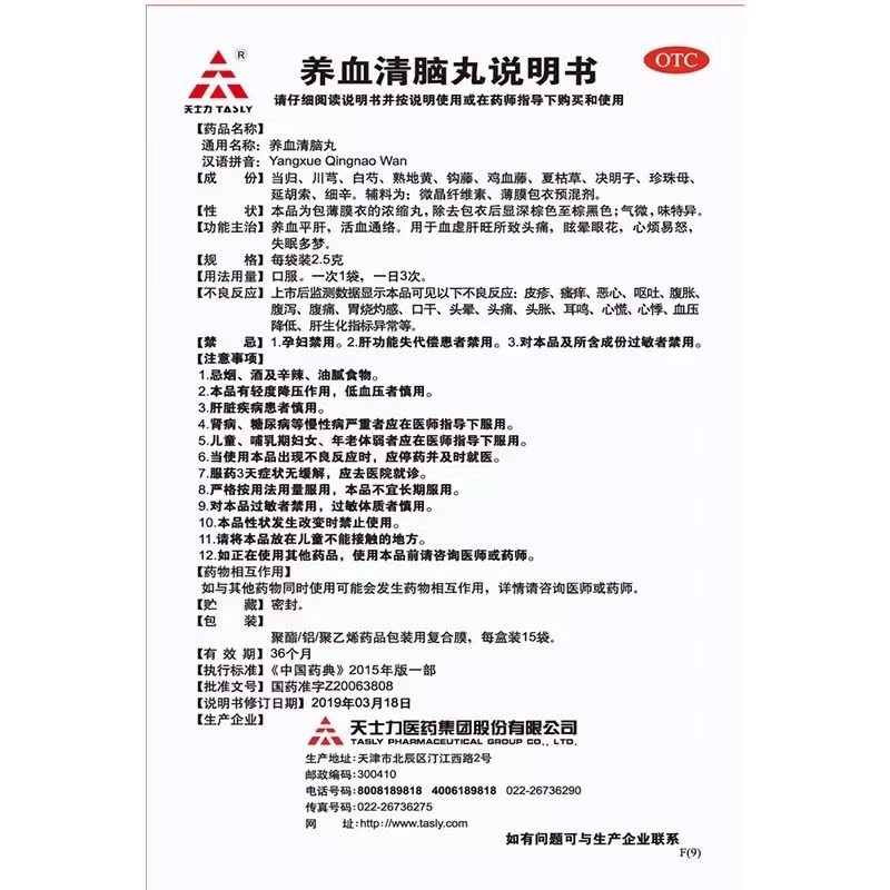 【天士力】养血清脑丸2.5g*15袋/盒头痛失眠活血通络血虚