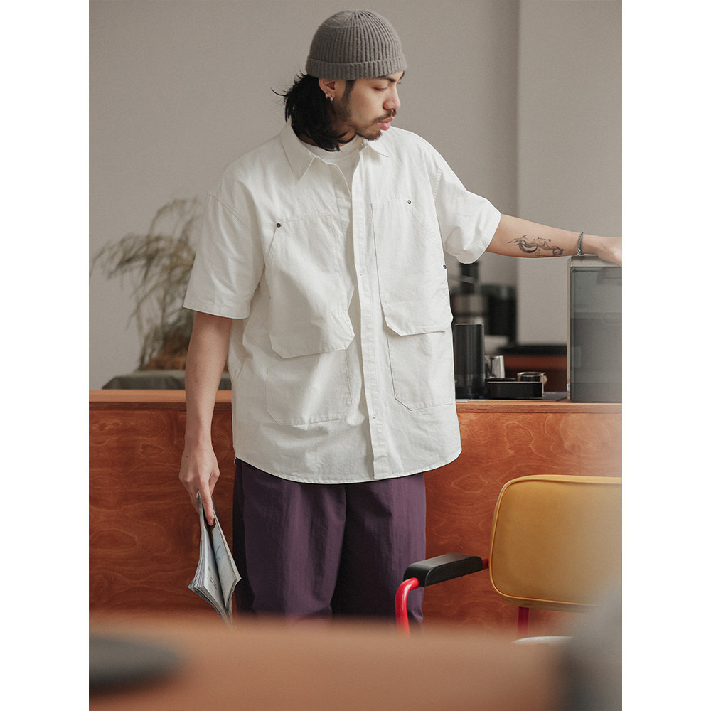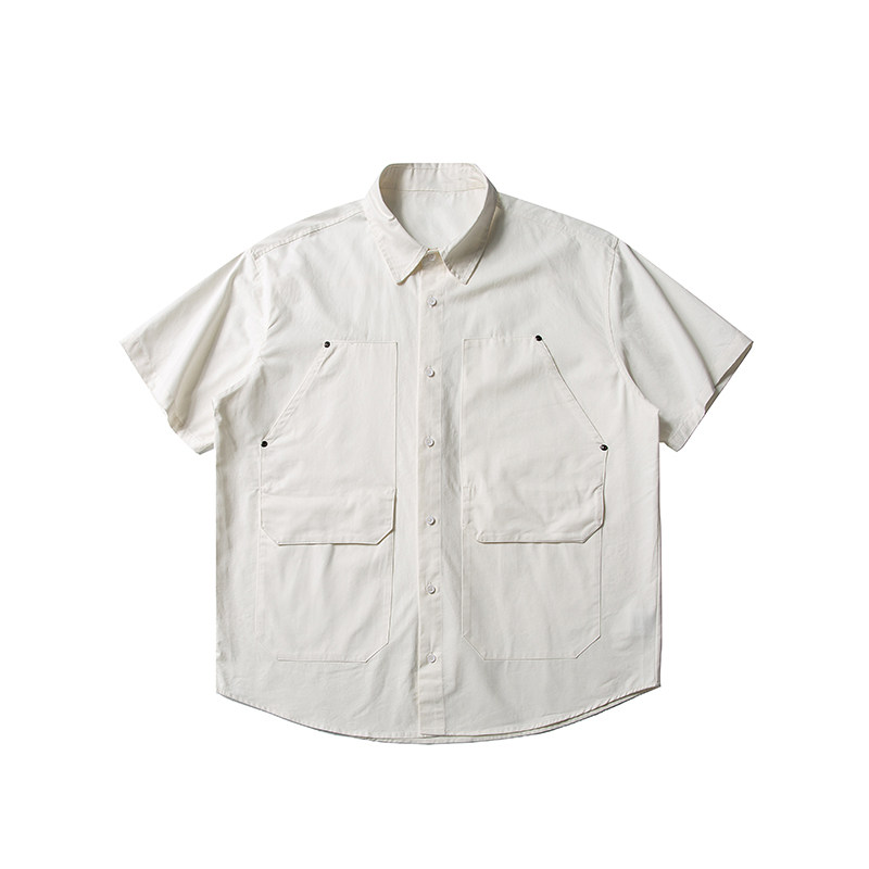 NOEARS春夏复古工装白色双口袋短袖衬衫日系cityboy宽松半袖衬衣