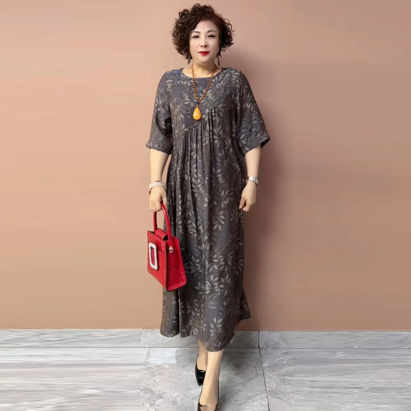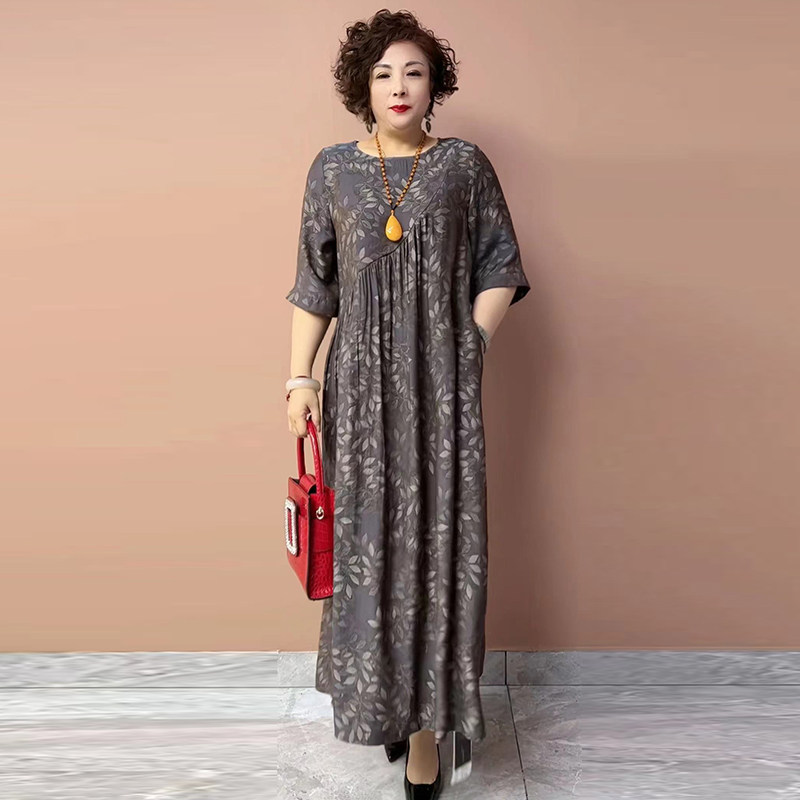 2025夏季新款圆领碎花短袖真丝大码减龄长裙子中年妈妈花色连衣裙