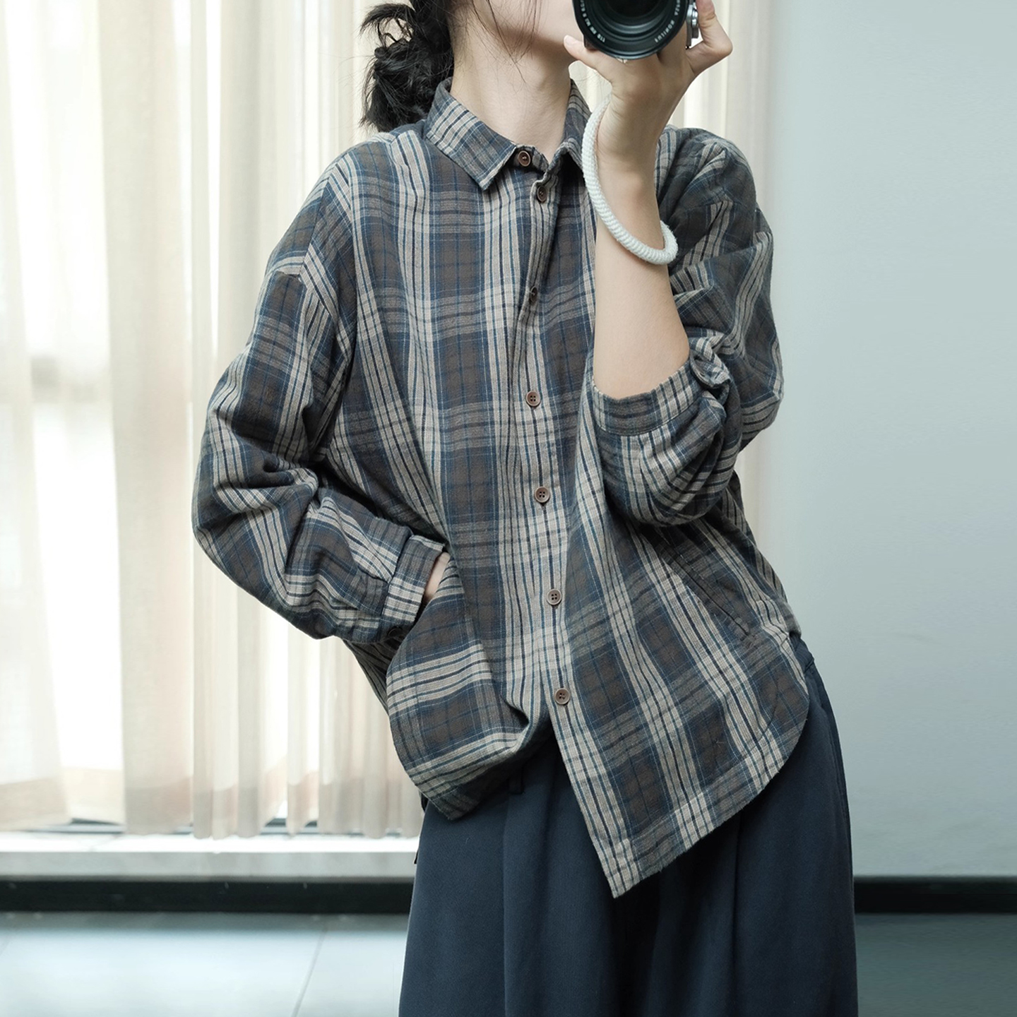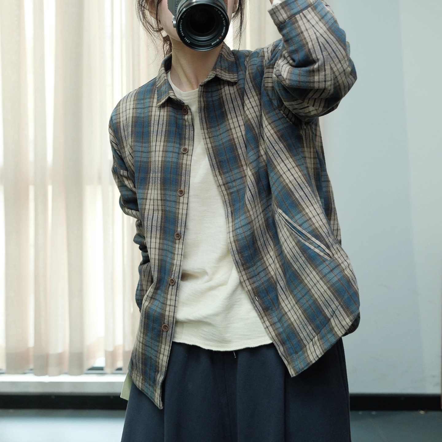 古与色韩版复古格子宽松大码休闲长袖亚麻夹棉衬衫短外套棉服女冬