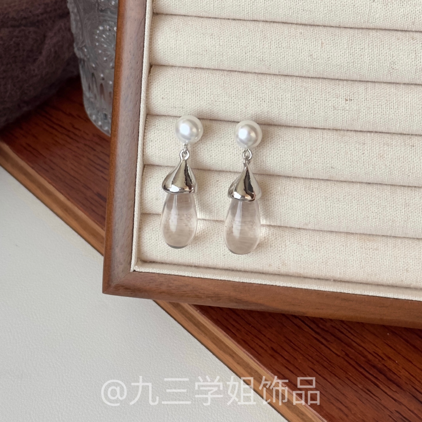 韩国博主同款S925银针透明水滴珍珠耳环白色法式高级感长款耳饰