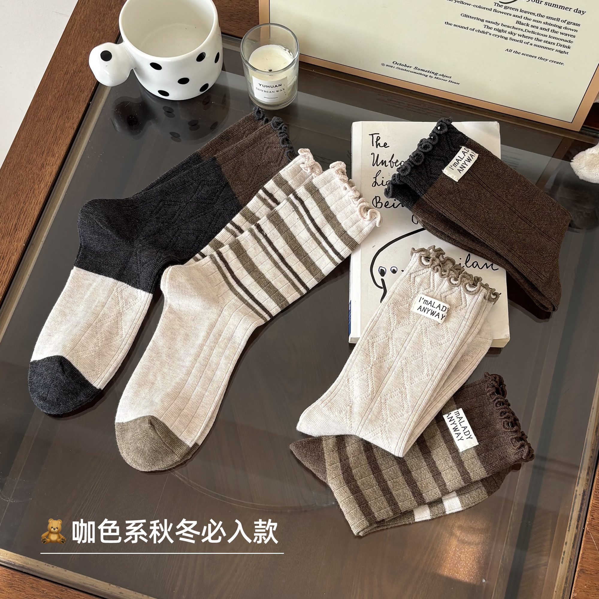 袜子女款秋冬季新款条纹花边中筒袜纯棉美拉德色系长袜搭配小皮鞋