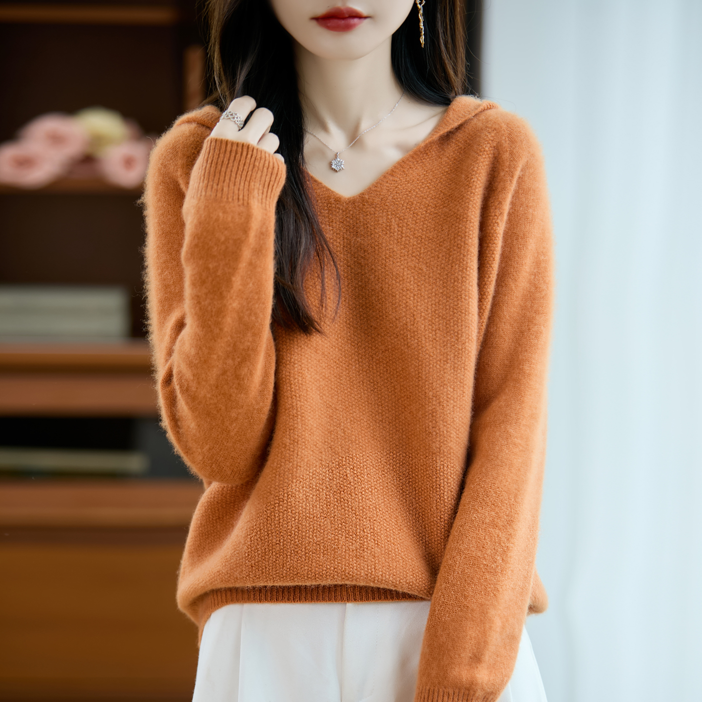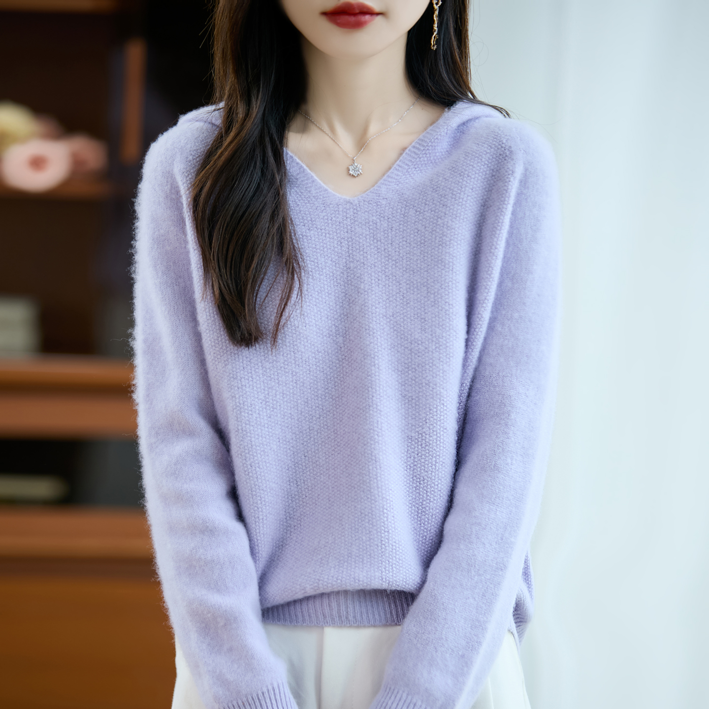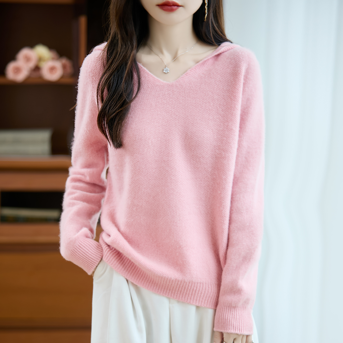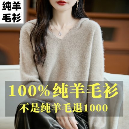 2025春秋新款羊毛衫女士加厚连帽V领针织衫宽松显瘦毛衣外套外搭