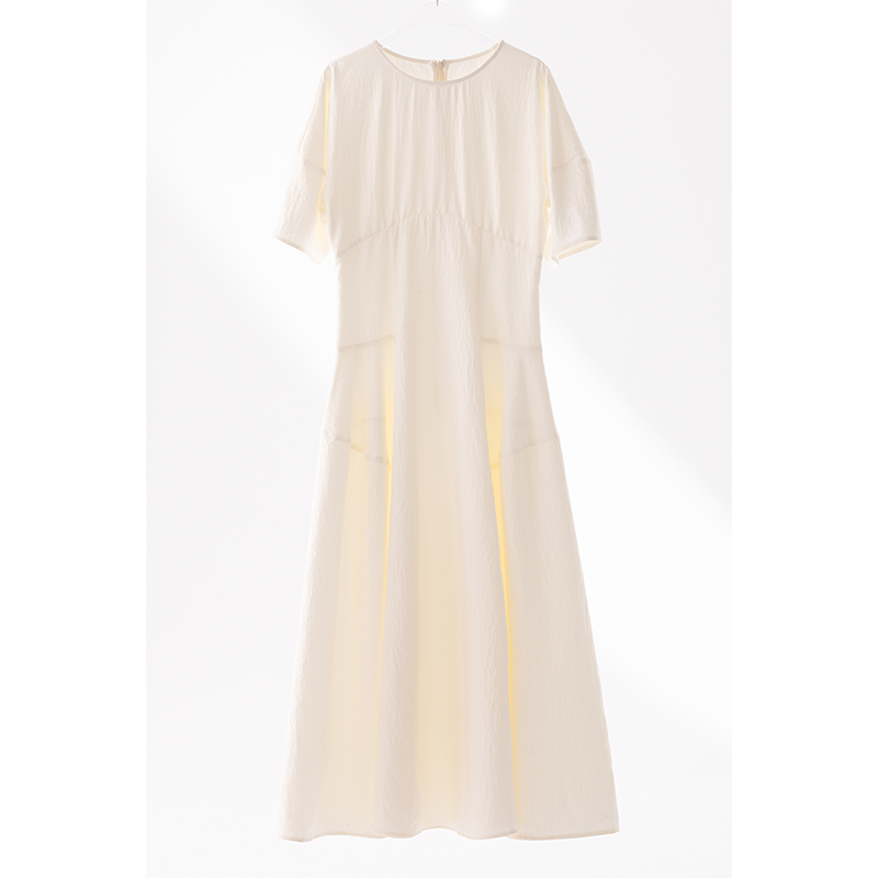 CR奶油风米白收腰大摆短袖连衣裙