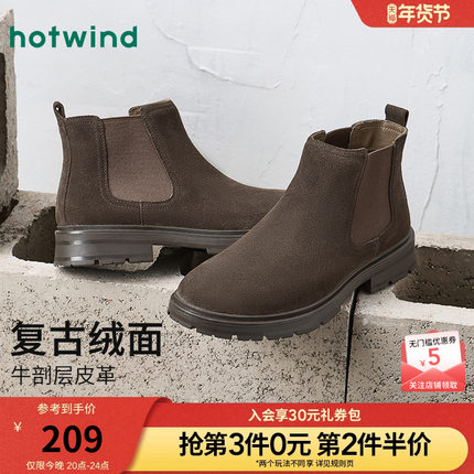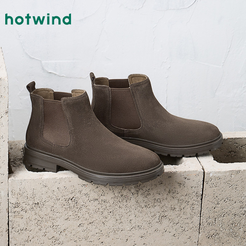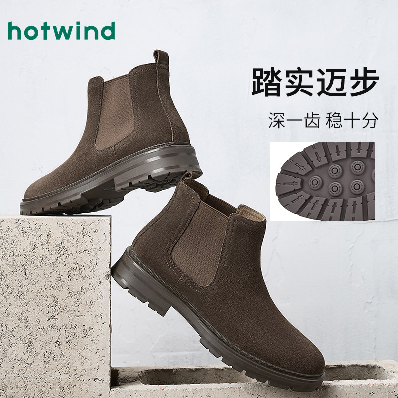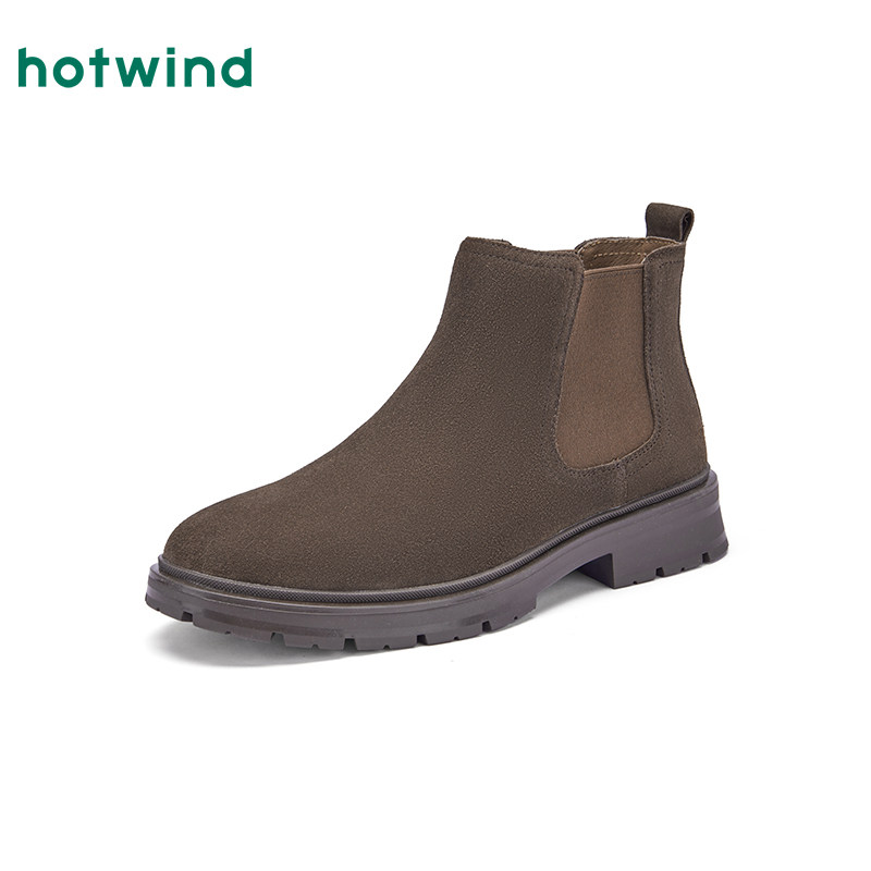 热风男鞋2025年冬季新款男士厚底休闲短靴复古百搭切尔西靴棕色